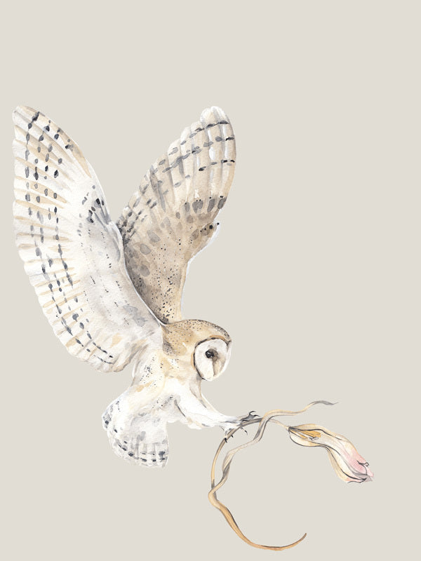 Hunter - A beautiful watercolour painted owl flies against a beige background.