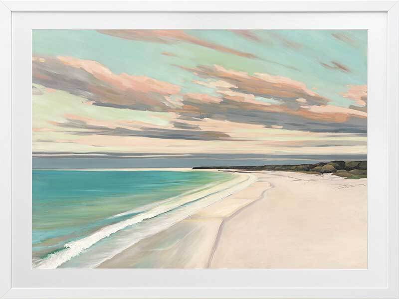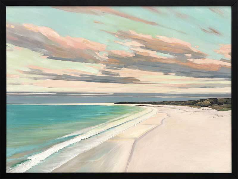 Hymn Framed Art Print - Inspired by the iconic Hyams Beach, NSW, this piece from the Darren Palmer artwork collection captures the confluence of ocean, sand, and forest. "Hymn" pays homage to Darren's love for the dreamy coastal getaway, where he now owns a home that he will forever cherish. As the canvas unveils white sands, turquoise waters, rocky forests, and clouds basking in warm sunlight, it bathes your home in pure serenity. This artwork is a dreamy harmony of light blues, oranges, pinks, and sand tones, making it perfect for any interior style.