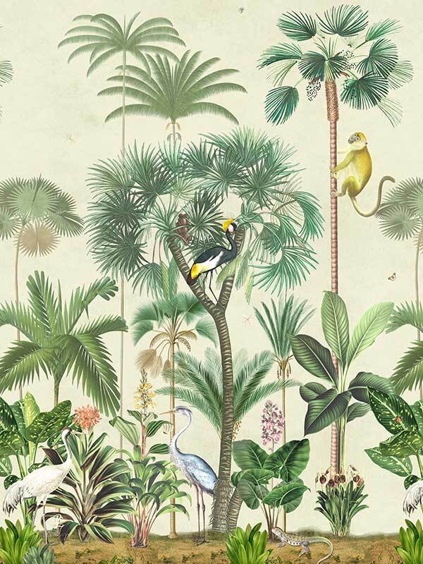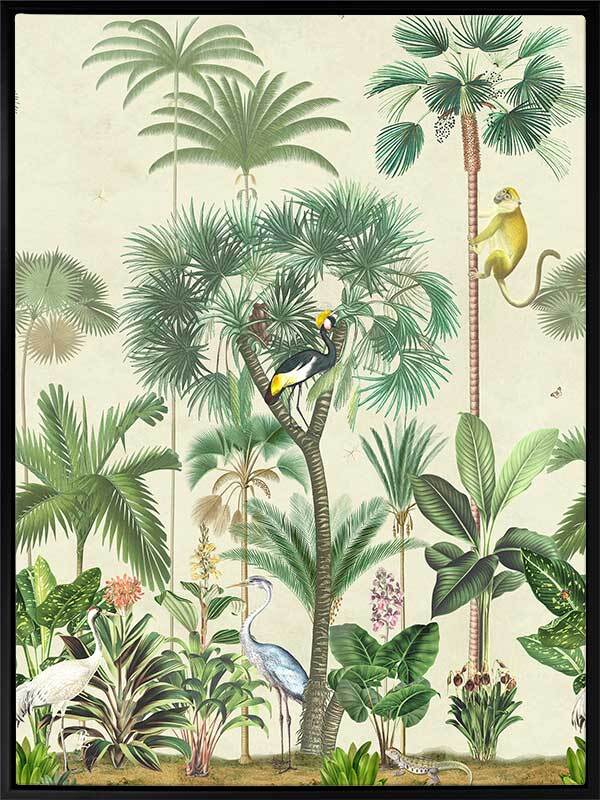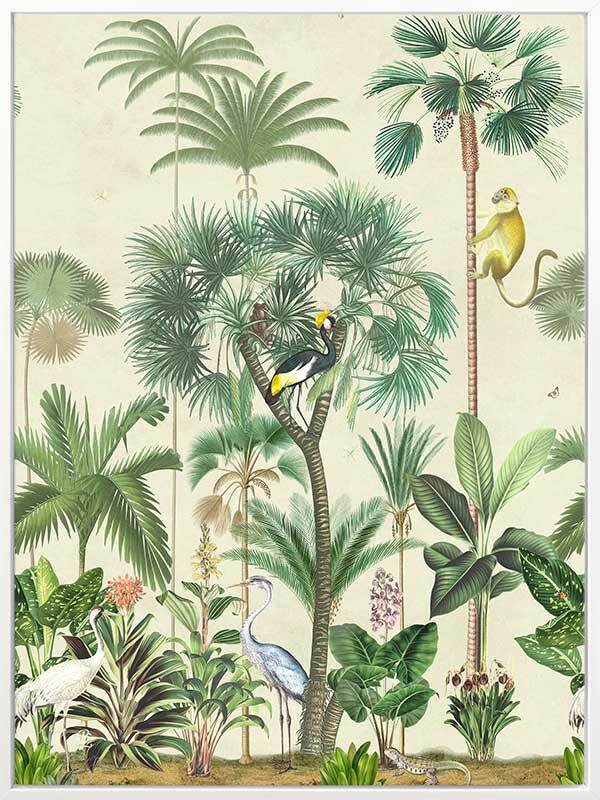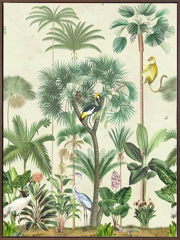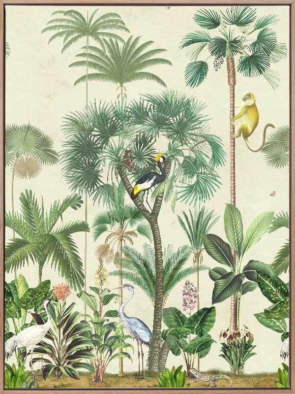 Indian Summer Beige I Canvas Art Print - Inspired by humid Indian Summers, this intricate piece is a conversation-starter for any space. All the animals are out to play, hidden amongst the tropical plants on a hot, misty morning, insects buzzing at every turn. With the pale beige background and forest green foliage, this piece creates all the tropical vibes you need to escape to a holiday getaway for endless hot, summer afternoons.
