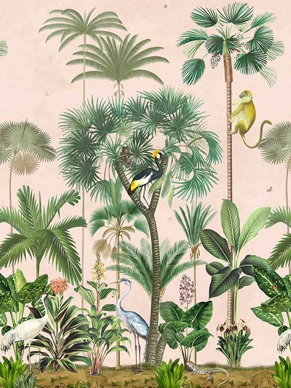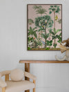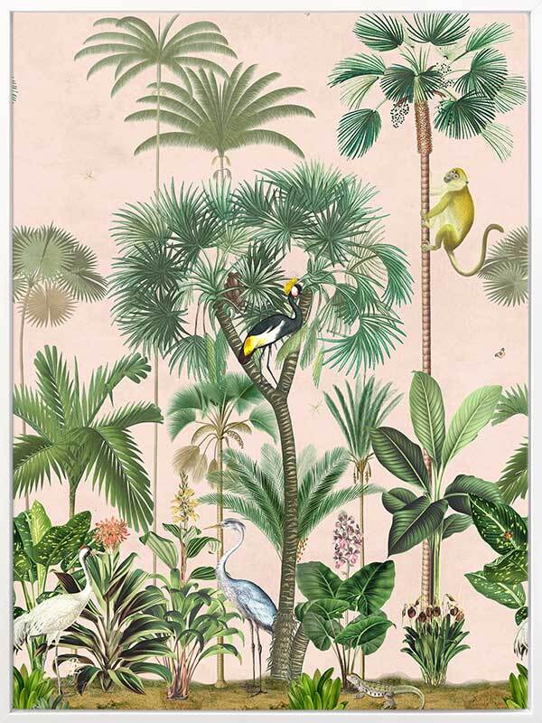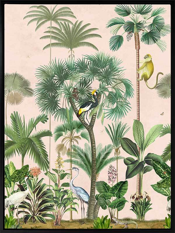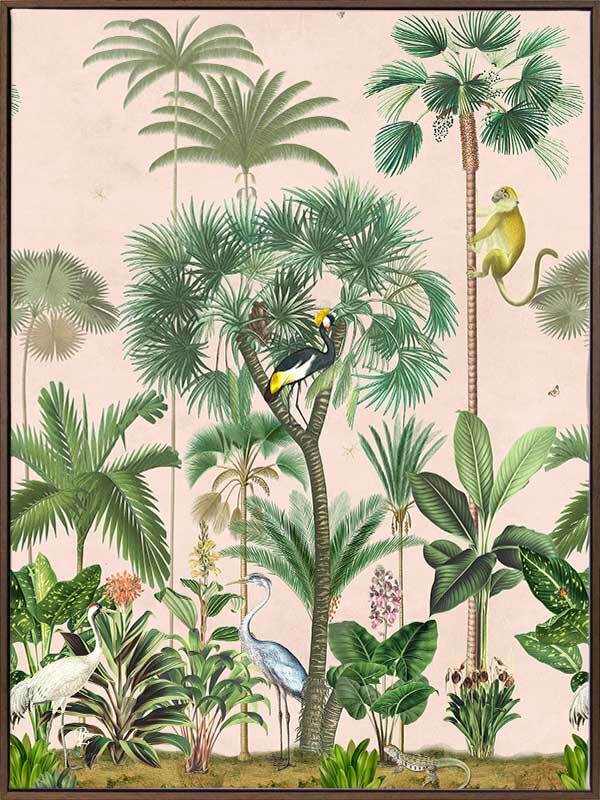 Indian Summer Pink I Canvas Art Print - Inspired by humid Indian Summers, this intricate piece is a conversation-starter for any space. All the animals are out to play, hidden amongst the tropical plants on a hot, misty morning, insects buzzing at every turn. With the pale pink background and forest green foliage, this piece creates all the tropical vibes you need to escape to a holiday getaway for endless hot, summer afternoons.