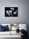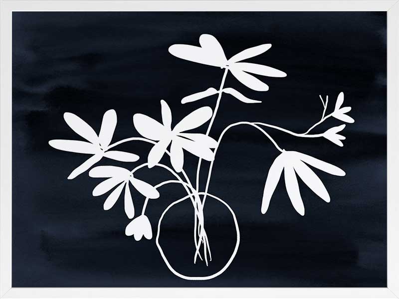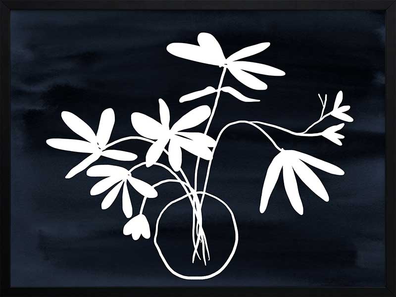 Indigo Etchings III - A beautifully balanced artwork that contrasts a white painted vase of flowers against a deep, indigo watercolour background. Pairs with Indigo Etchings I and II.