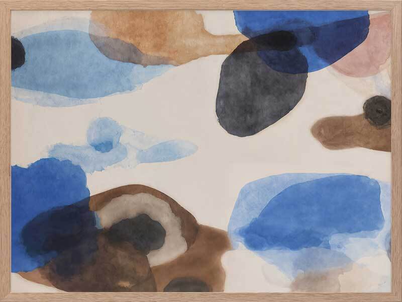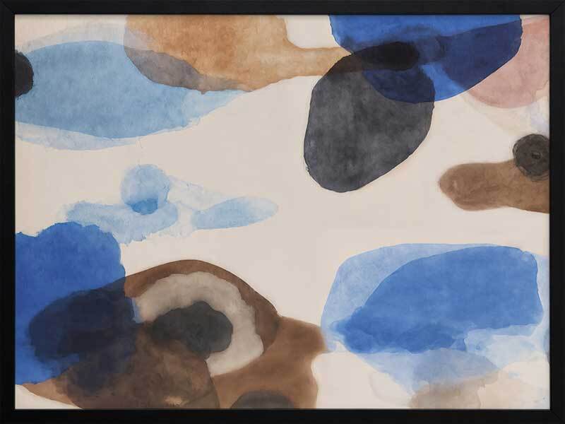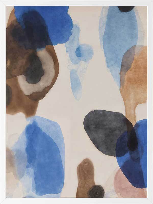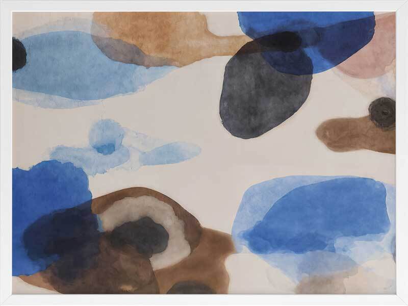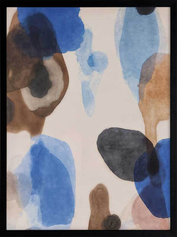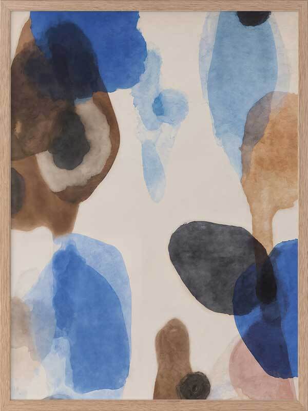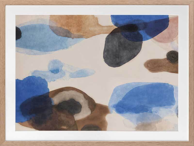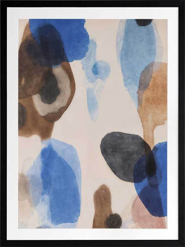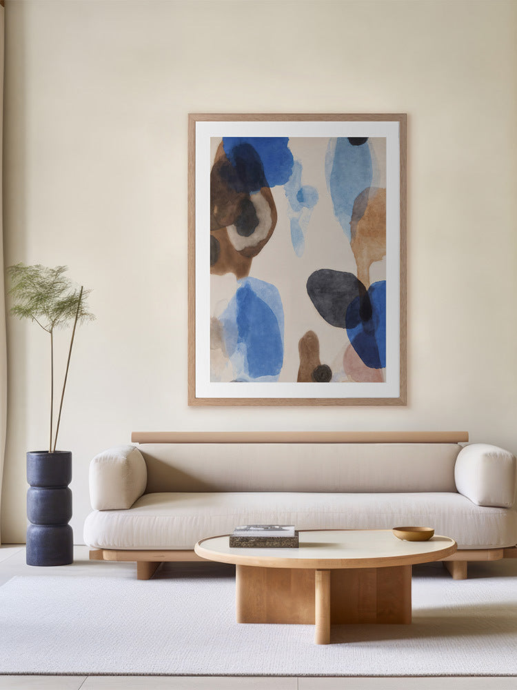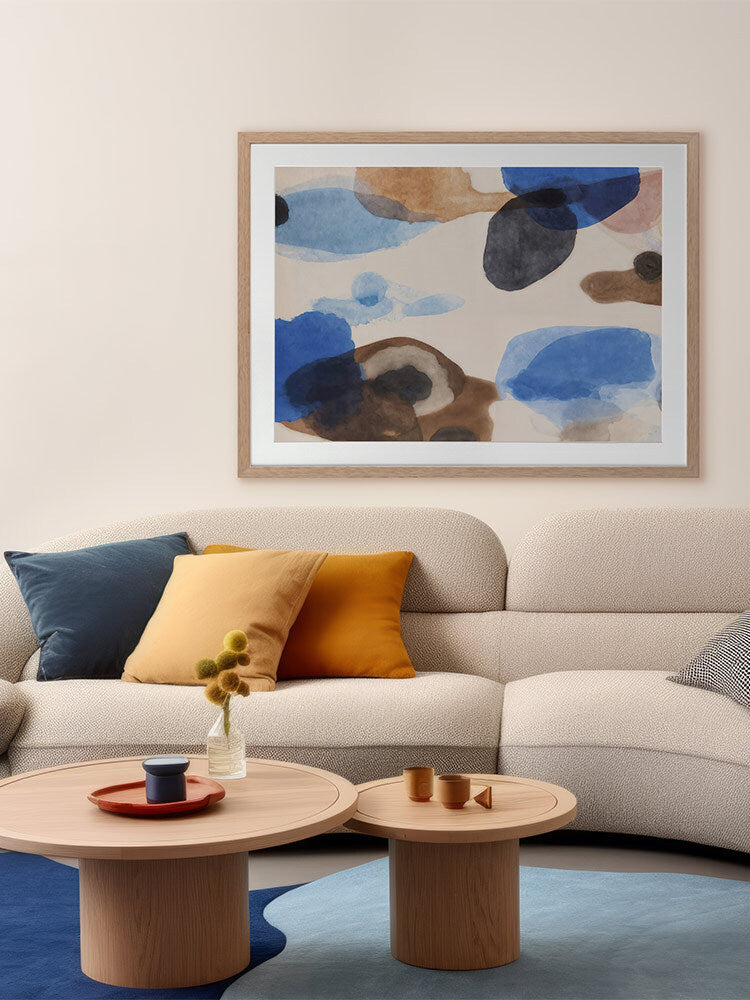 Indigo Impressions II Framed Art Print - A spotted masterpiece, this calming abstract artwork invites you to enjoy the interplay between colours and circular shapes, as they flow gently across the canvas. Brown, indigo blue, and beige dots are carefully placed, yet are so innately natural in their movements. Pair with Indigo Impressions I and III.