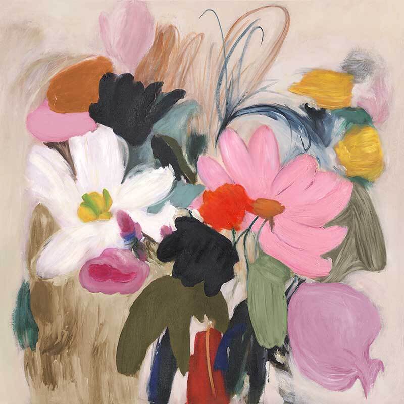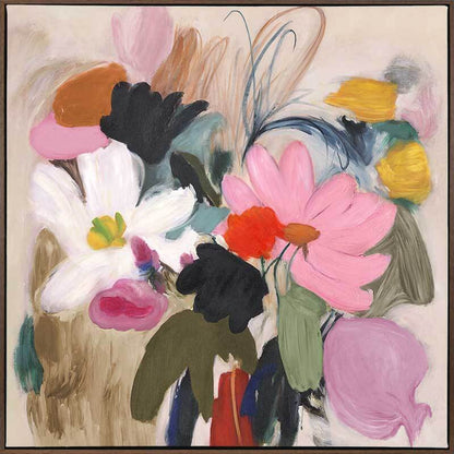 Innocence in Bloom Canvas Art Print - Created in collaboration with Interior Designer, Darren Palmer, "Innocence in Bloom" portrays a playful, naively styled arrangement of flowers that captures the pure and joyful essence of youth. Warm tones of pink, yellow, red, and brown pop against cooler tones of blue and green, each colour blending seamlessly, mirroring the unadulterated beauty of all nature's creations. Like each brushstroke is dancing across the page, this piece beckons you to fall in love with the playful embrace of nature's gems.