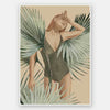 Intuitive Unframed Art Print - Patricia Mendes x Urban Road - A beautifully soft and feminine illustration featuring a sunkissed woman in a swimsuit surrounded by large fan palm fronds. The colour palette is muted and warm, with soft clay, brown, khaki green, and sage tones.