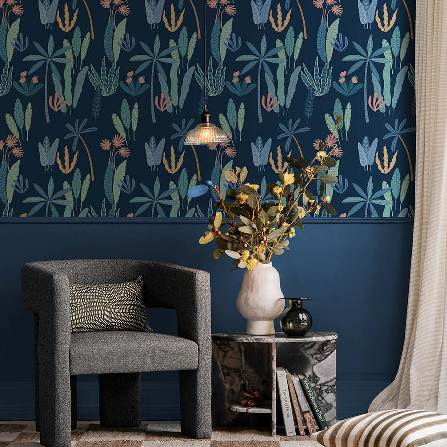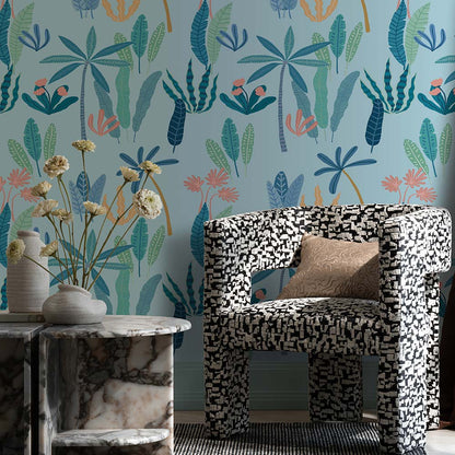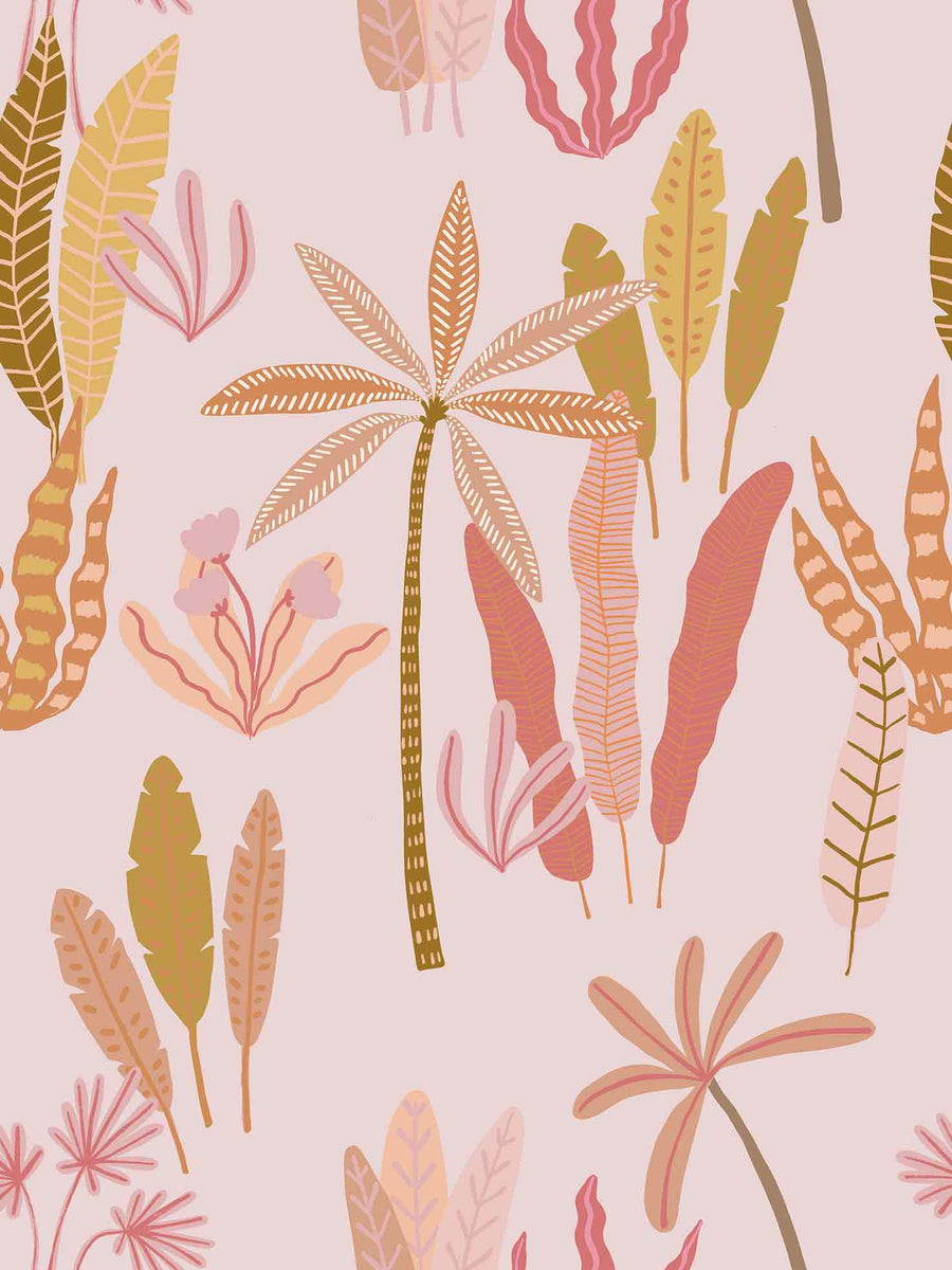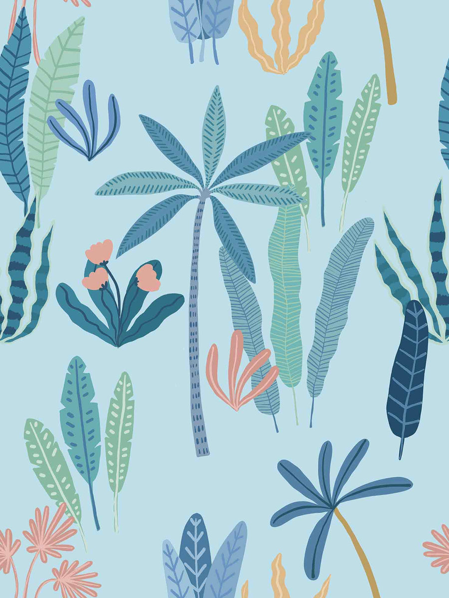 Designed to spark curiosity and imagination, this pattern wallpaper is full of movement, from swaying fronds to pops of delicate flowers, creating a dynamic and adventurous atmosphere.