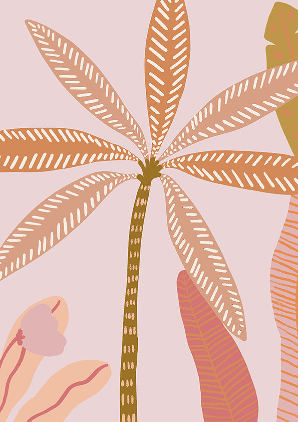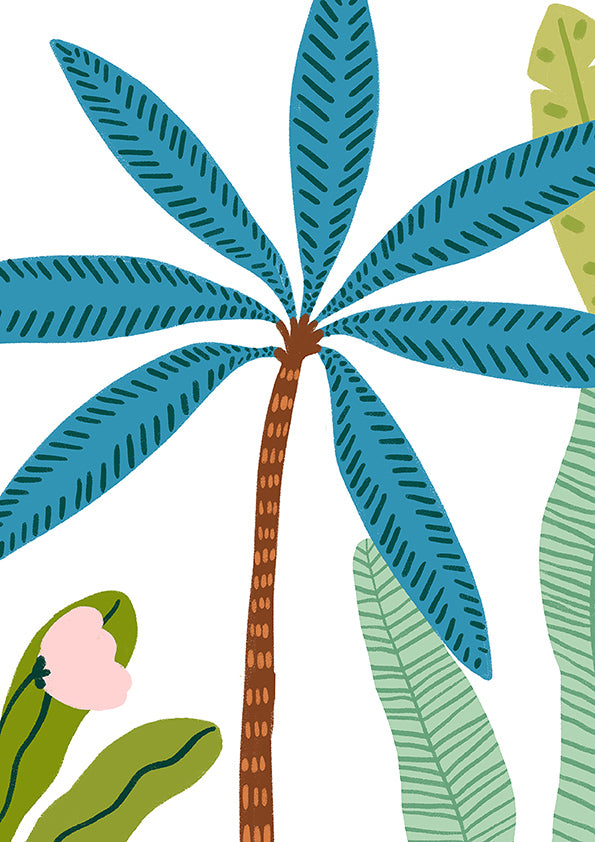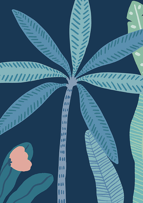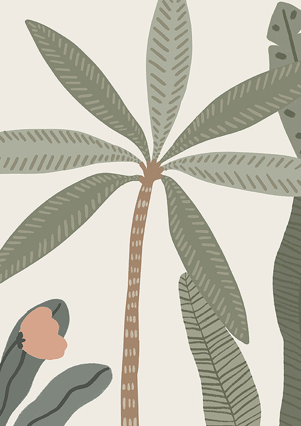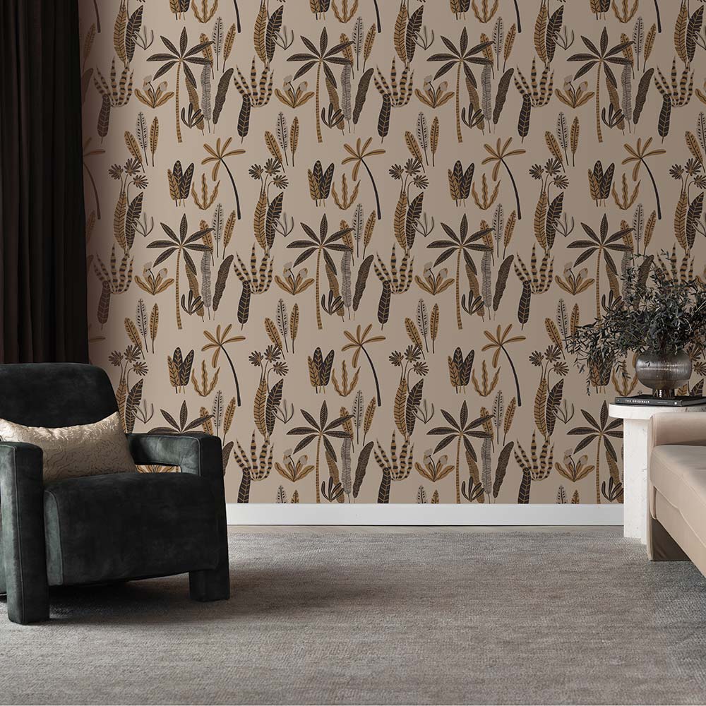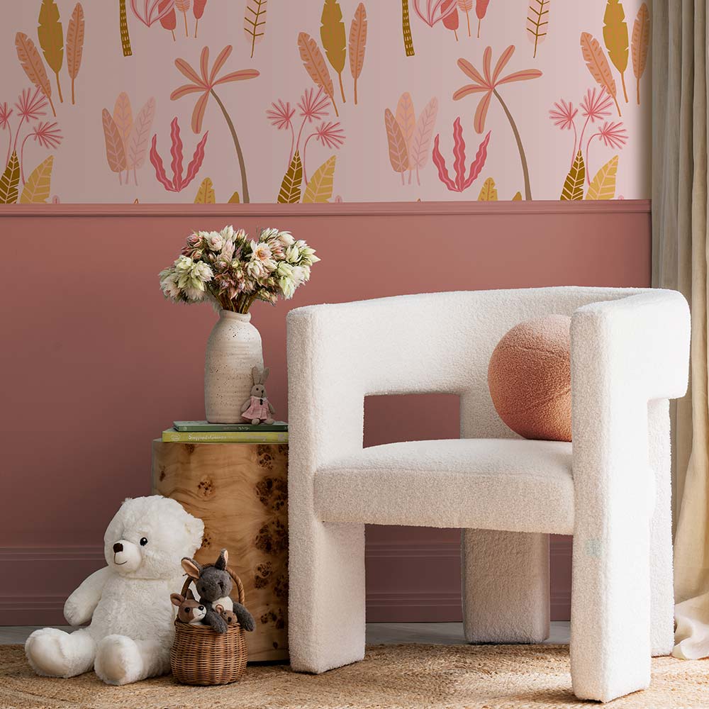 Designed to spark curiosity and imagination, this pattern wallpaper is full of movement, from swaying fronds to pops of delicate flowers, creating a dynamic and adventurous atmosphere.