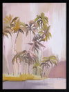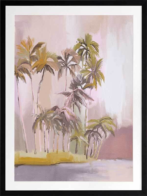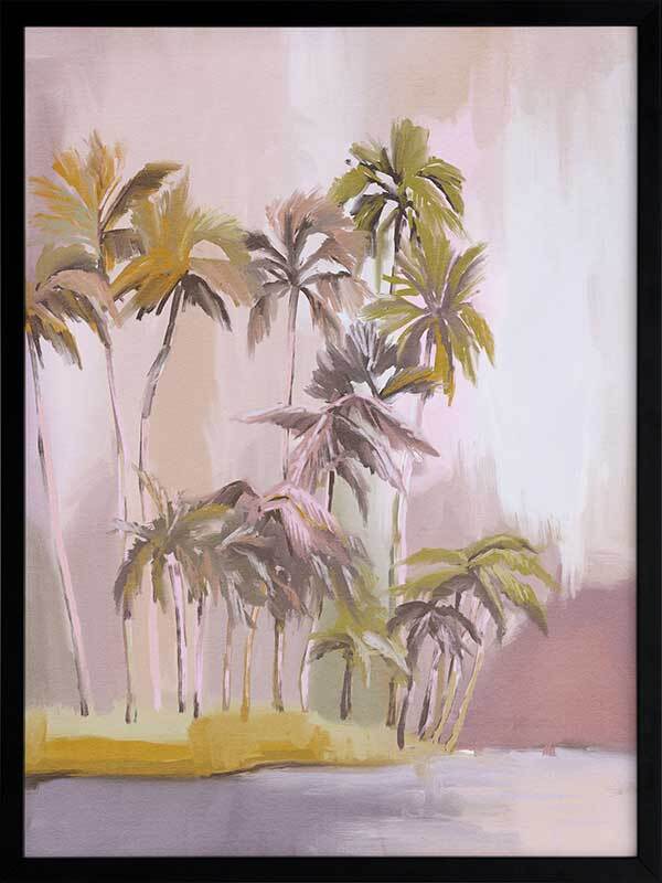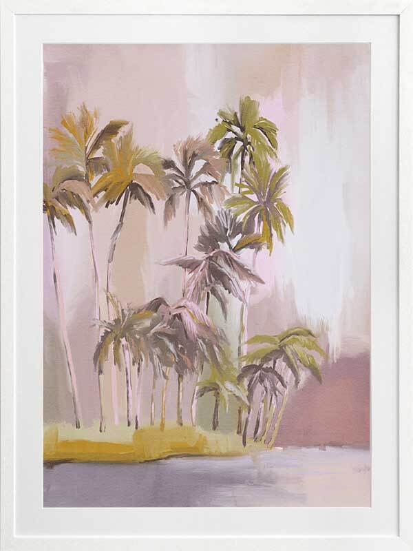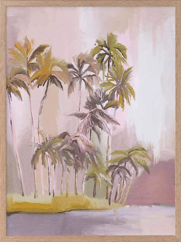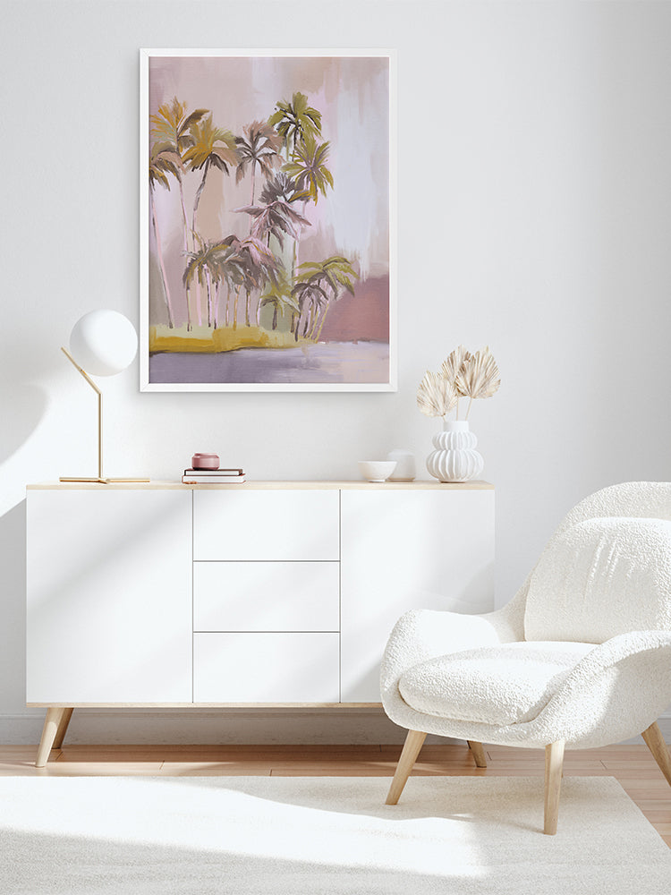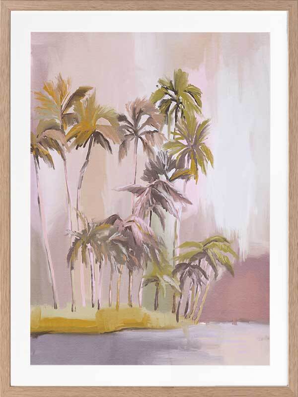Island of Solitude Framed Art Print - Soft, ethereal and feminine, this light and breezy tropical themed artwork features an island filled with tall, windswept palm trees. The colour palette is delicate and dreamy, with blush, purple and mauve tones.