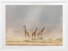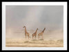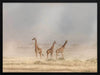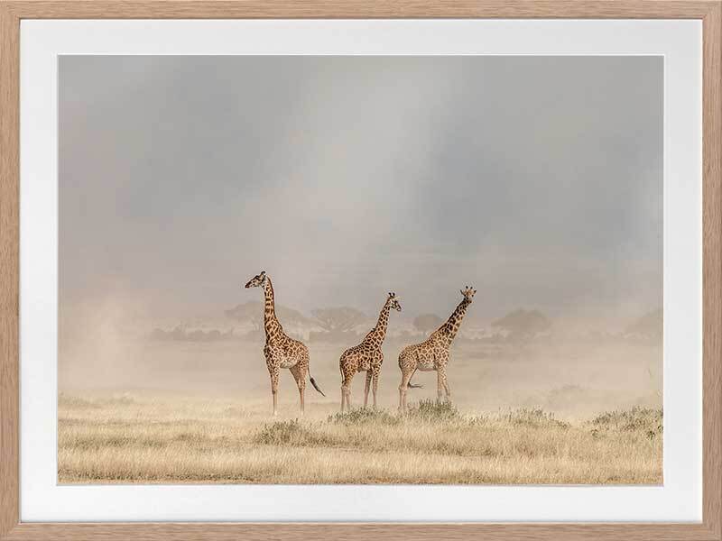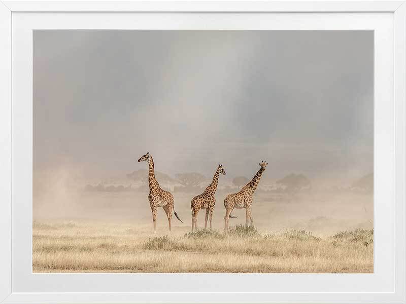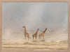 It's a Giraffe's world Framed Art Print - Let your love of animals show with this whimiscal giraffe print. This artwork would be perfect in a child's bedroom or anywhere your heart desires! It features three giraffes in focus against an out of focus backdrop of grass and trees. This colour palette is neutral with golden and brown tones from the giraffes and the landscape.
