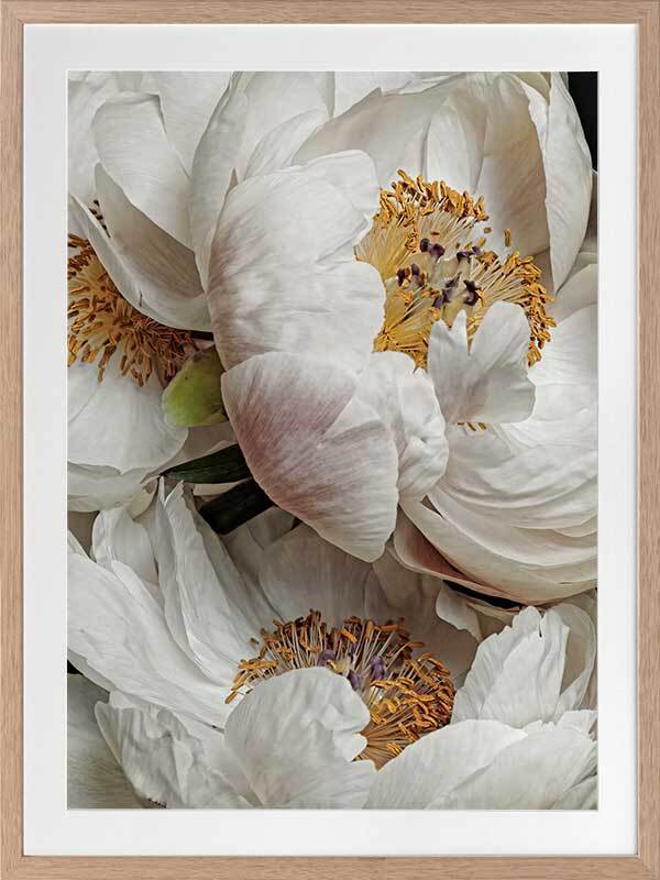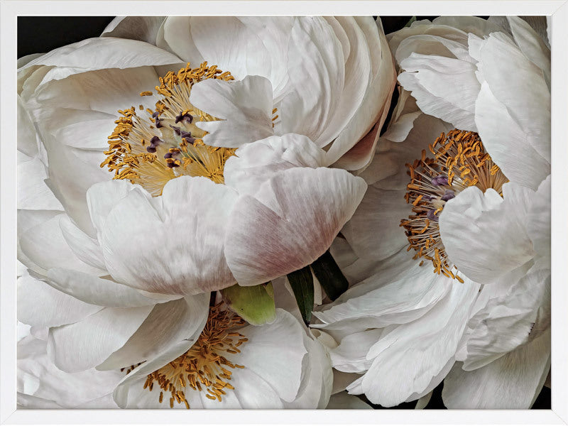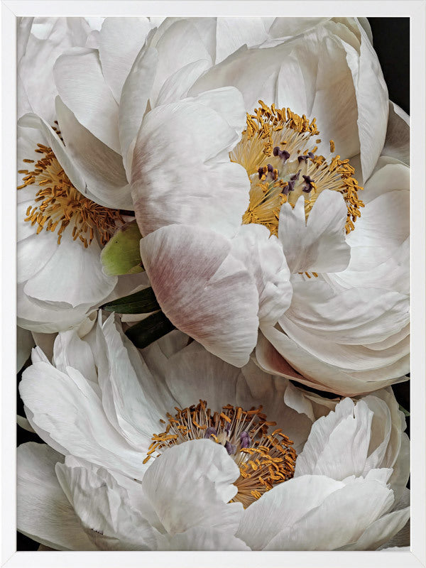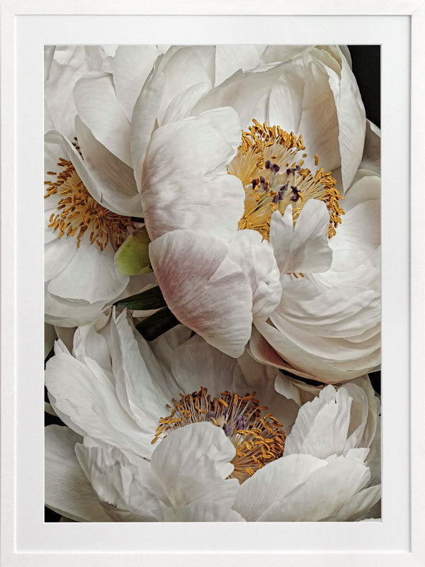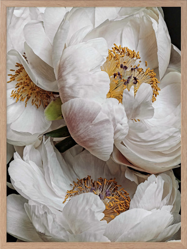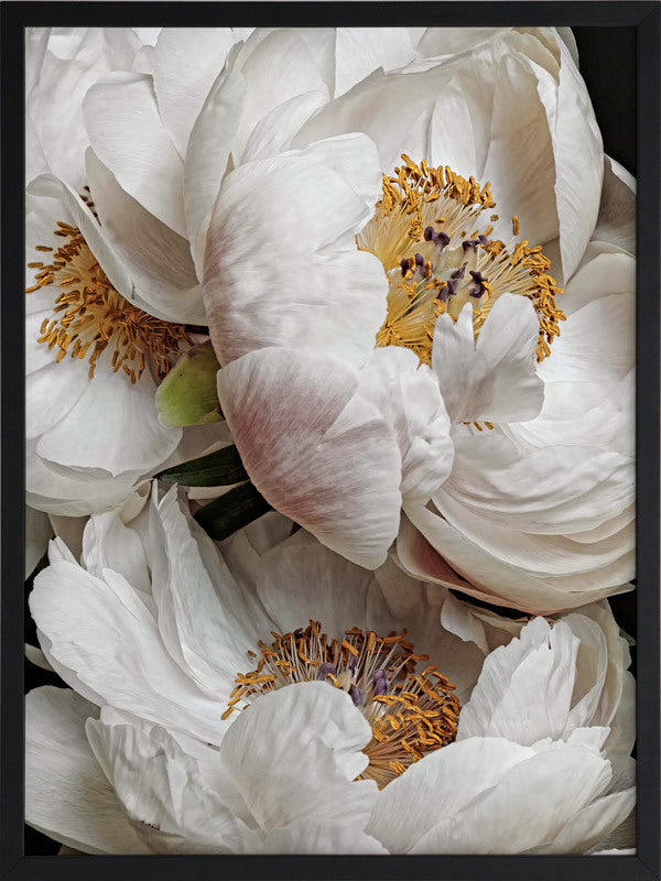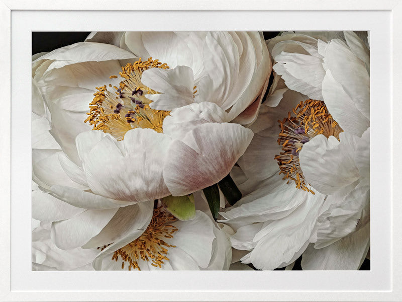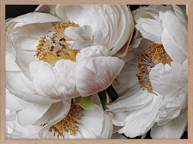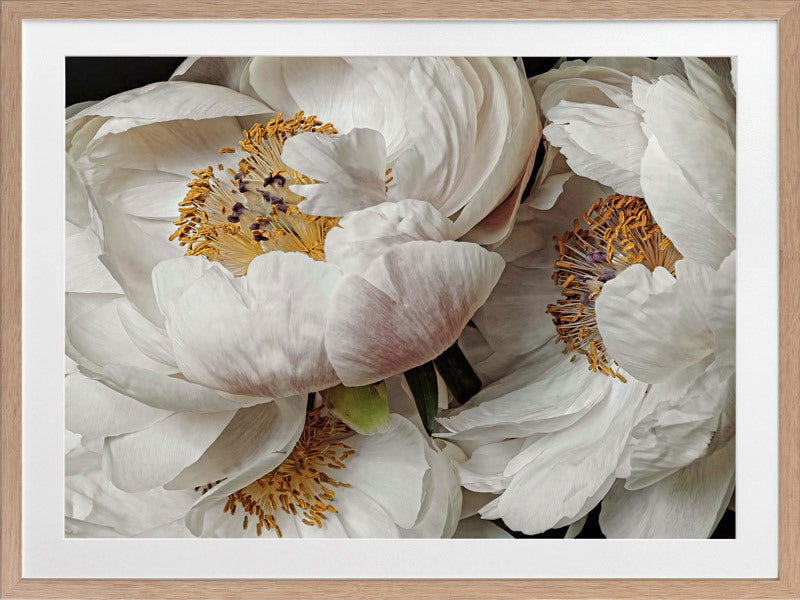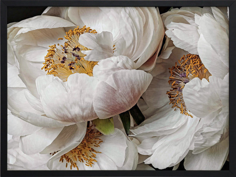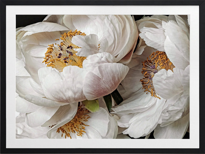Ivory Atlas Framed Print: A striking photographic print featuring a group of soft, cream and pink coloured peonies contrasted against a dark background. Pairs with Clair de Lune. 2019 AUTUMN/WINTER COLLECTION: ODYSSEY