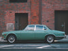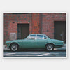 Jag - A photographic portrait of a green vintage car parked in front of a red brick building.