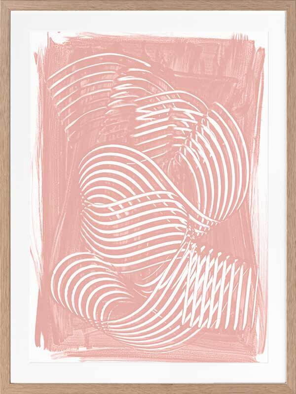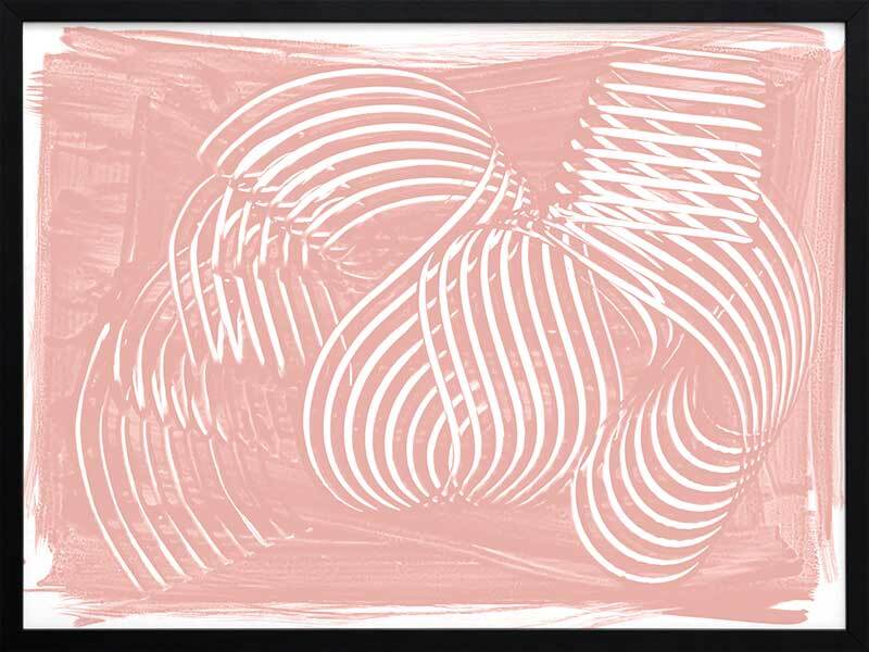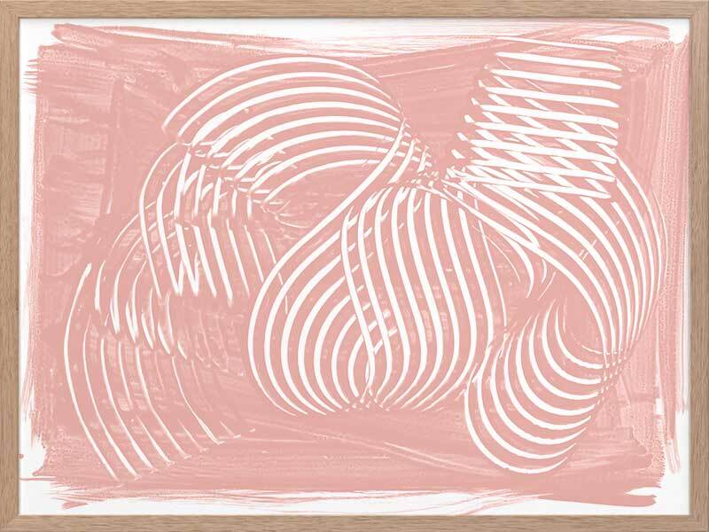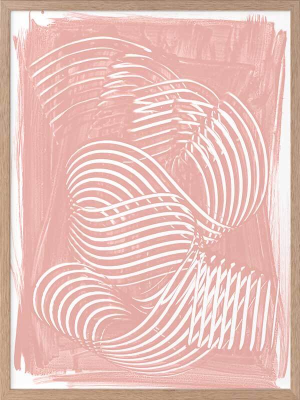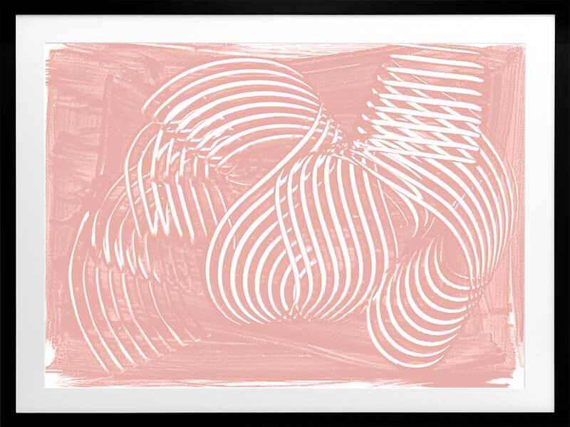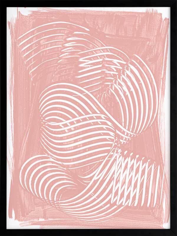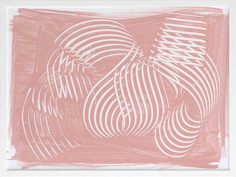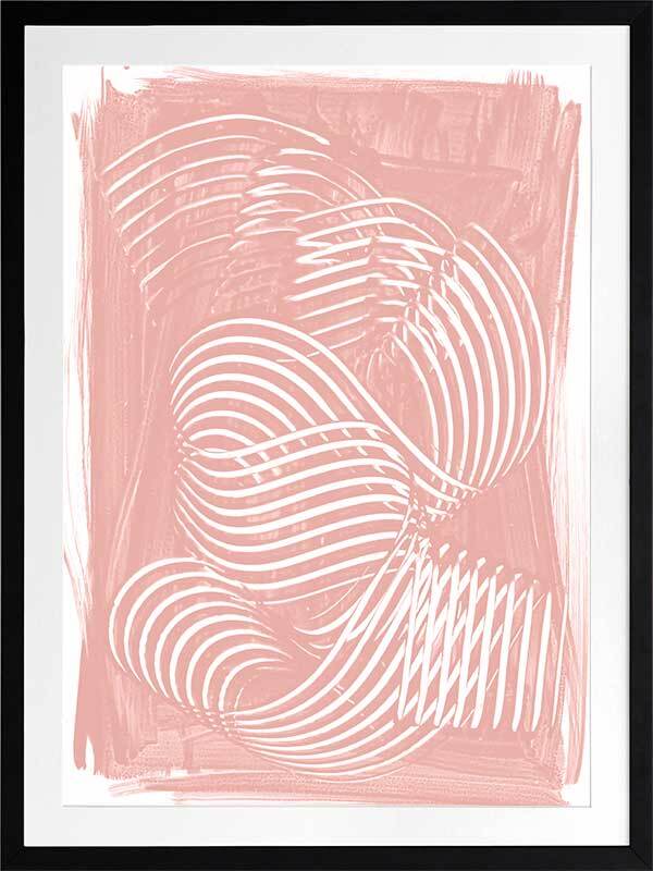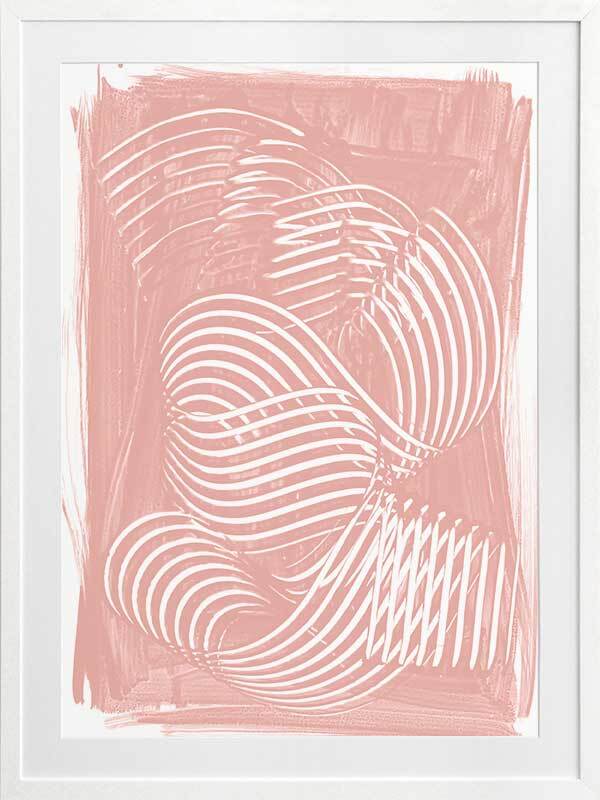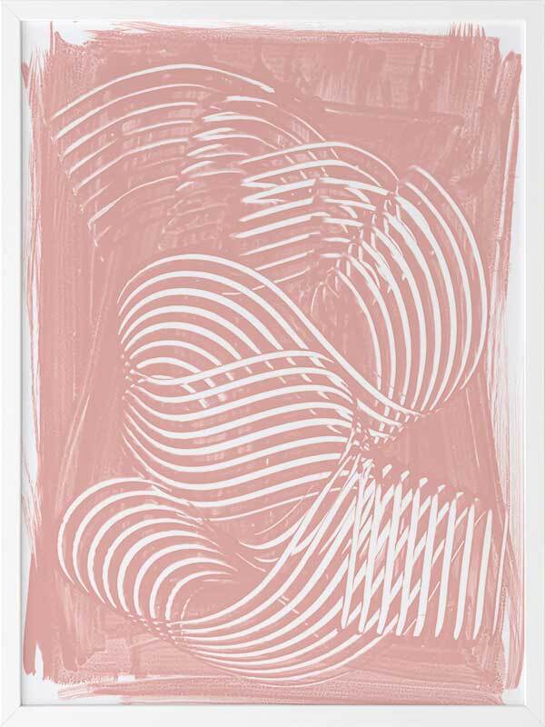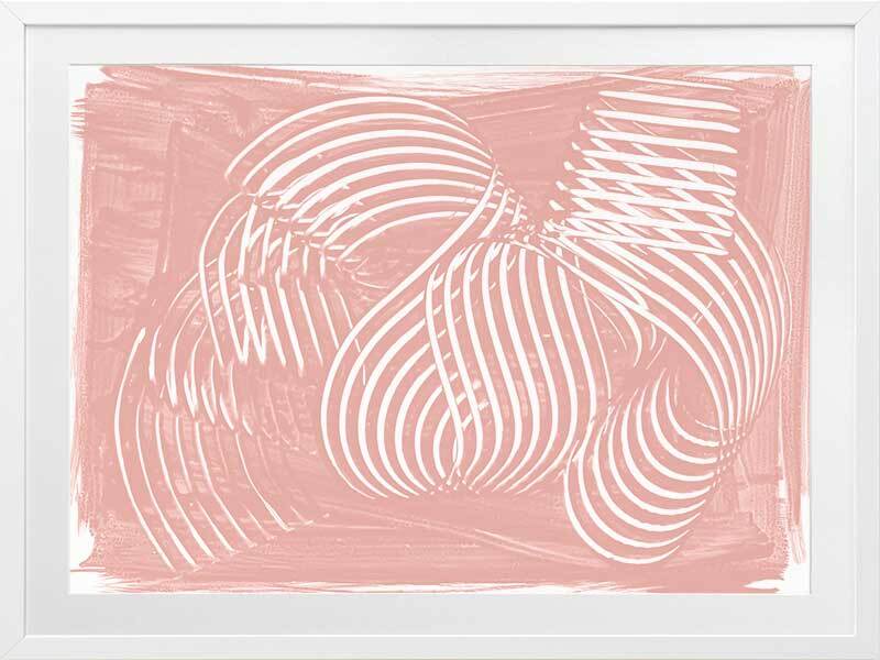 Jean I Framed Art Print - Textural, experimental and expressive, this simple abstract artwork uses paint strokes, curves and negative space to create an organic and mesmerising visual statement. The colour palette is soft and feminine, featuring white lines against a blush pink background. Artwork matches with Jean II, III and IV.