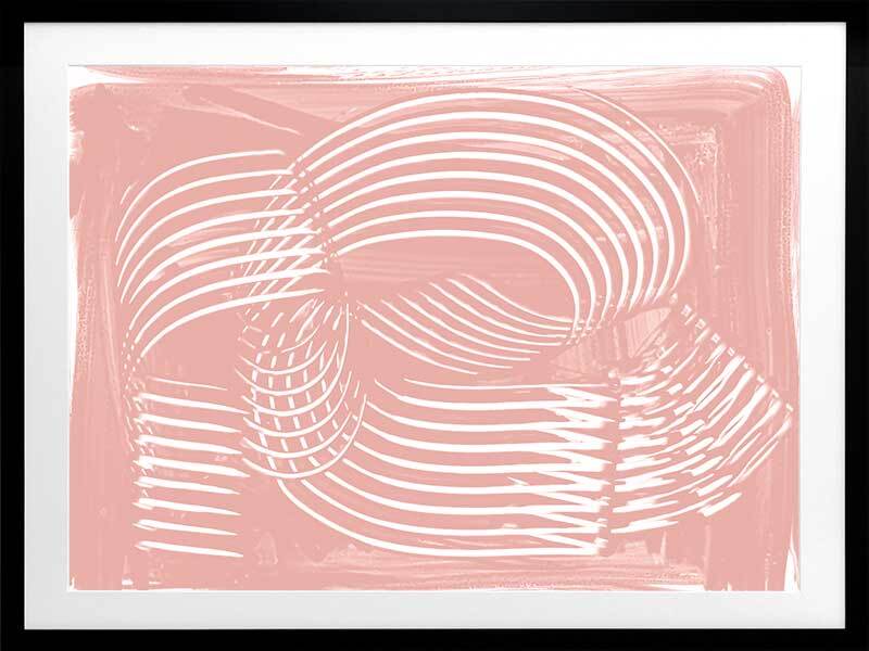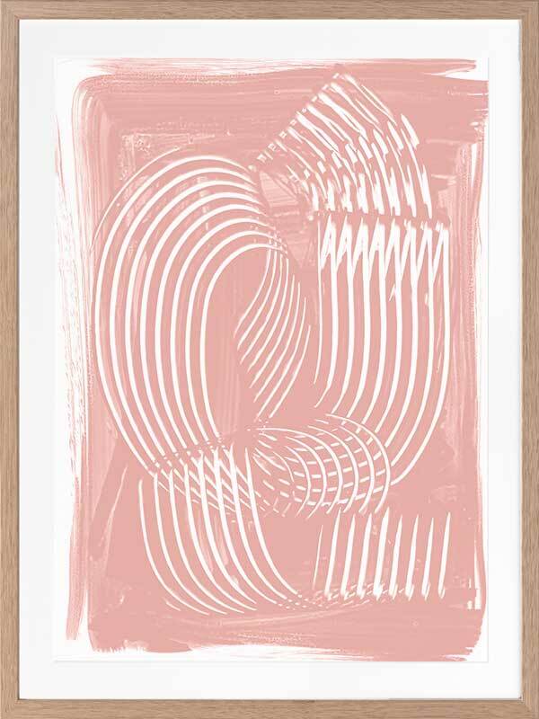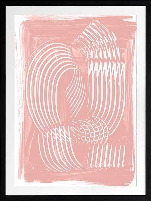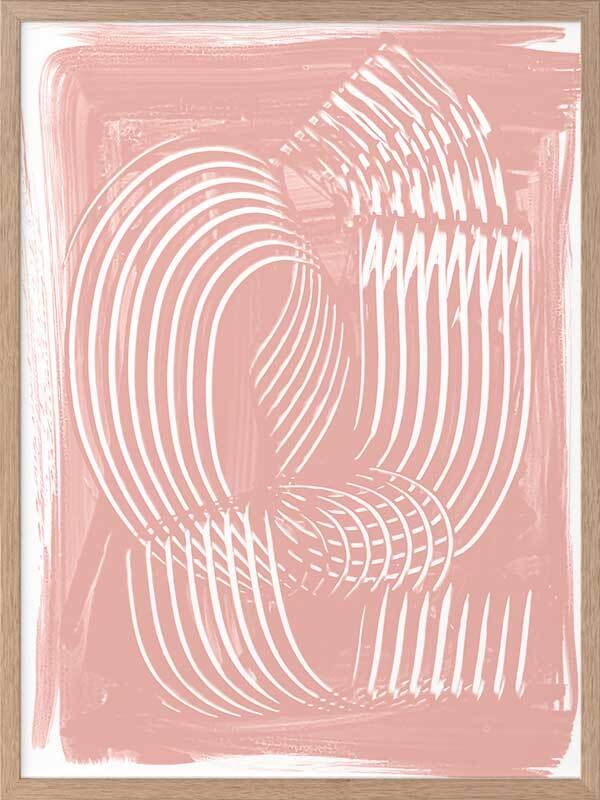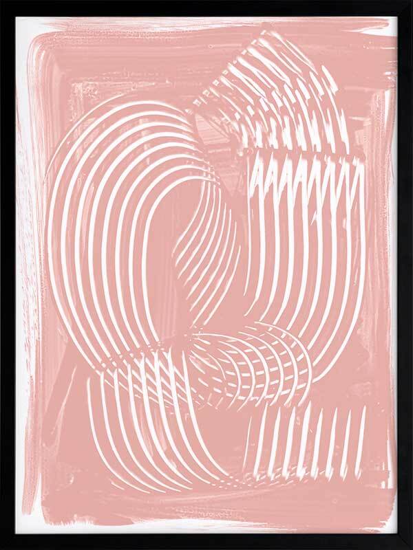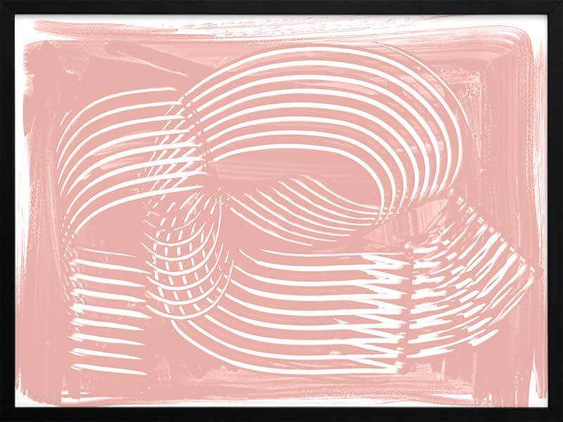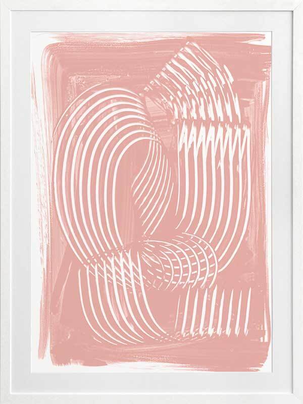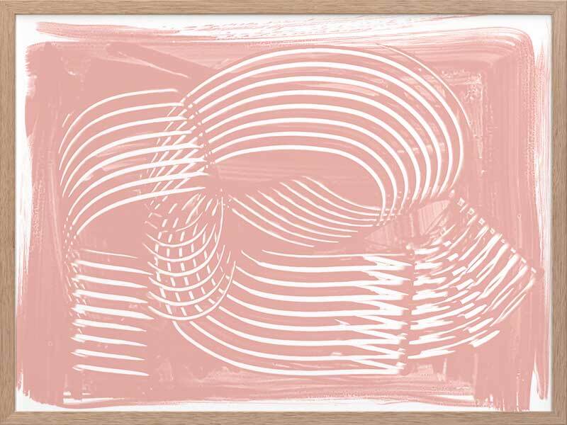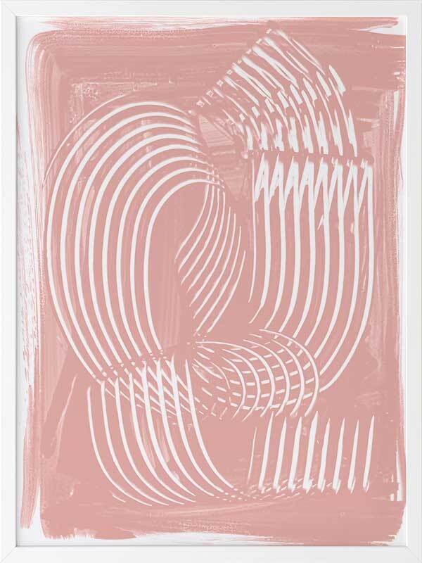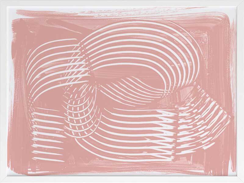 Jean III Framed Art Print - Textural, experimental and expressive, this simple abstract artwork uses paint strokes, curves and negative space to create an organic and mesmerising visual statement. The colour palette is soft and feminine, featuring white lines against a blush pink background. Artwork matches with Jean I, II and IV.