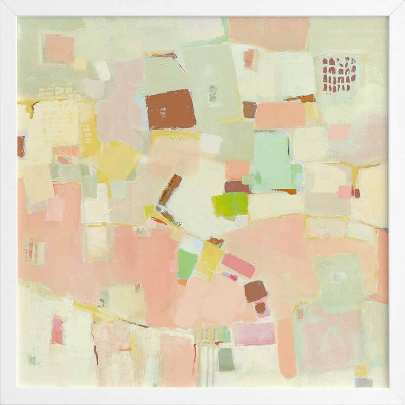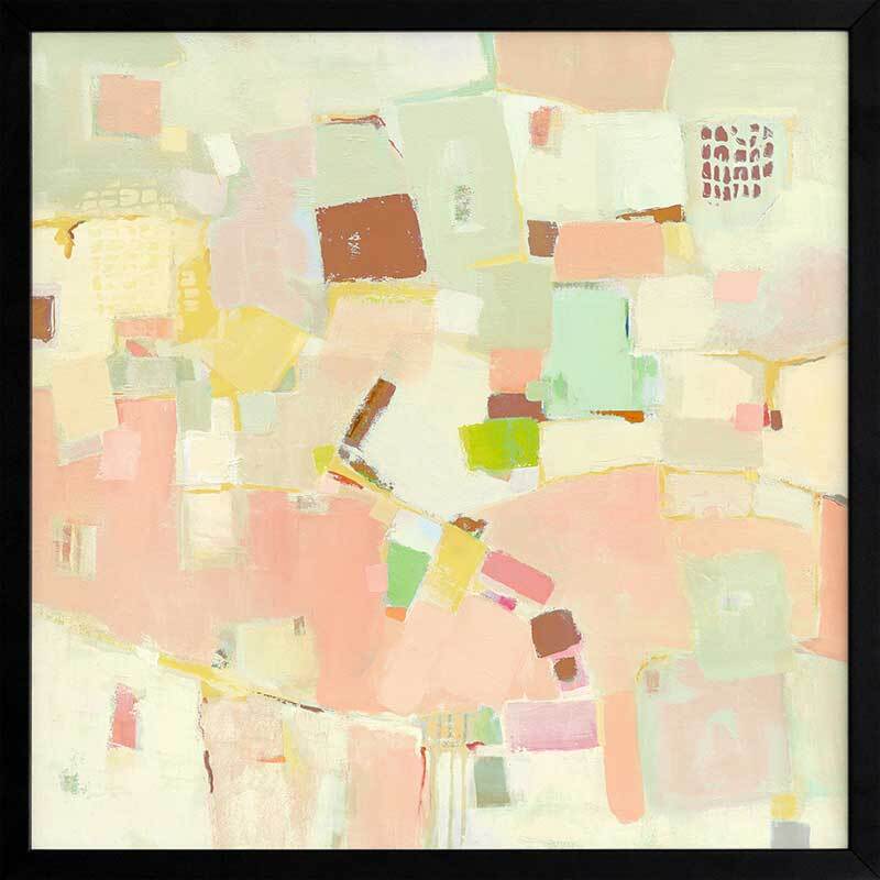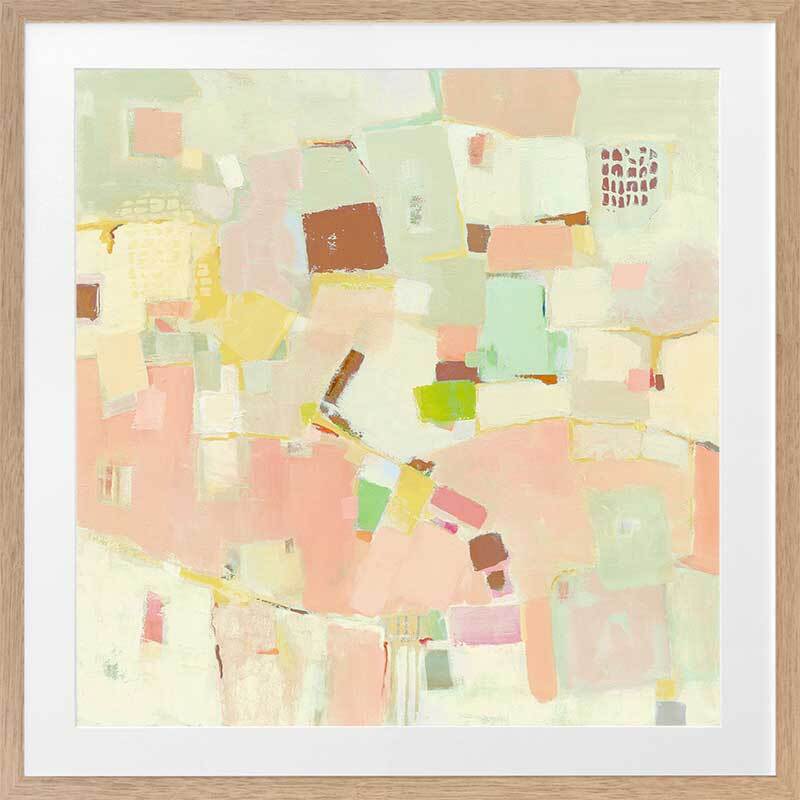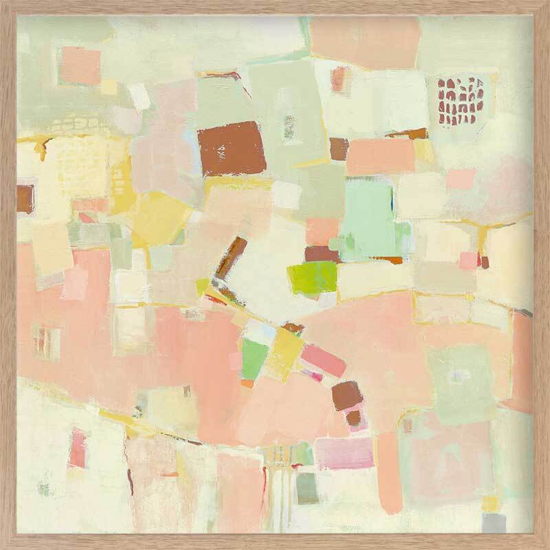 Jewelled Framed Art Print - Like glimmers of jewelled stones peeking through as the light hits. This abstract artwork brings a creative energy to your space with moving pieces and shapes, colliding to form a beautiful textural look. Palette includes pastel shades of green, pink and yellow, with hints of warm brown to complement neutral shades in your home.