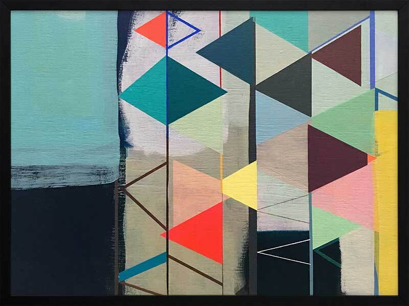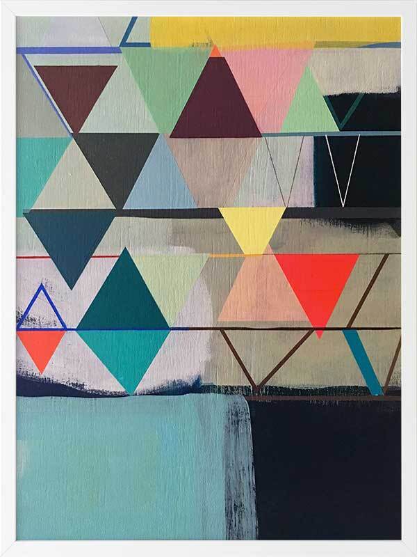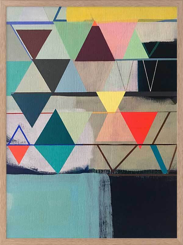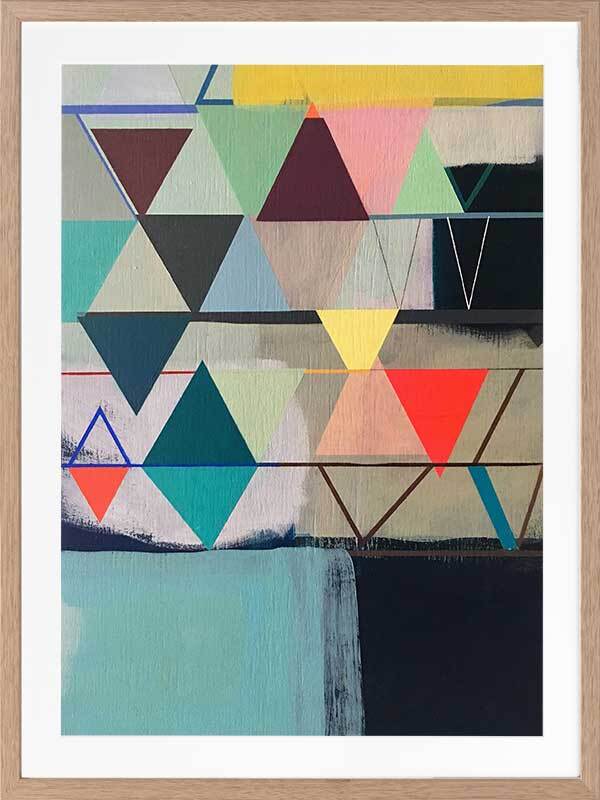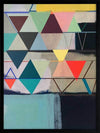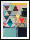 Journey Time I Framed Art Print - Create a sense of movement with this statement abstract piece, with a chaotic array of triangles, some small and some big, moving together in harmony. An odd blend of colours including neon orange, yellow, soft greens and blues, pinks, burgundy, and a blue, black, beige and pink backdrop means this piece suits many interior design styles.