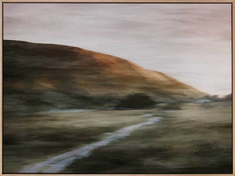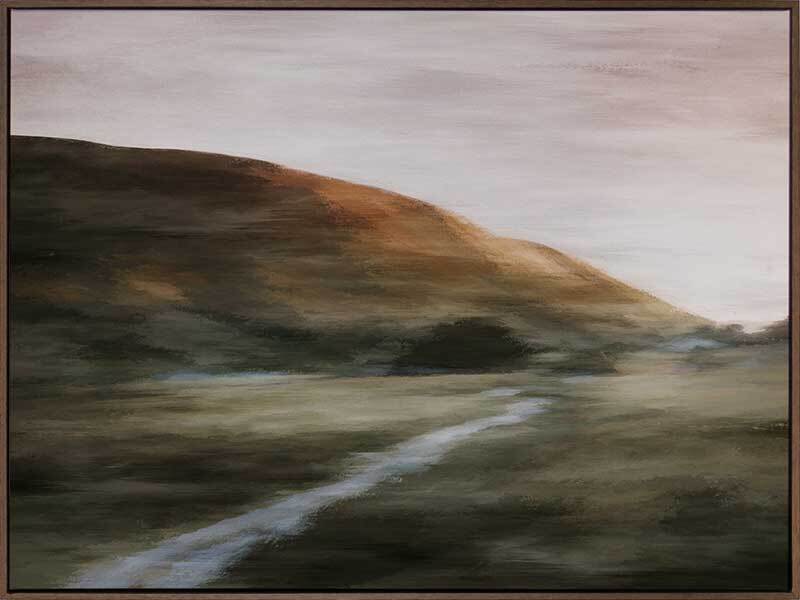 Joy Dawns Canvas Art Print: A blurred landscape artwork featuring a rolling hillside against a muted pink sky with a hint of warm, orange sunlight. 2019 AUTUMN/WINTER COLLECTION: ODYSSEY