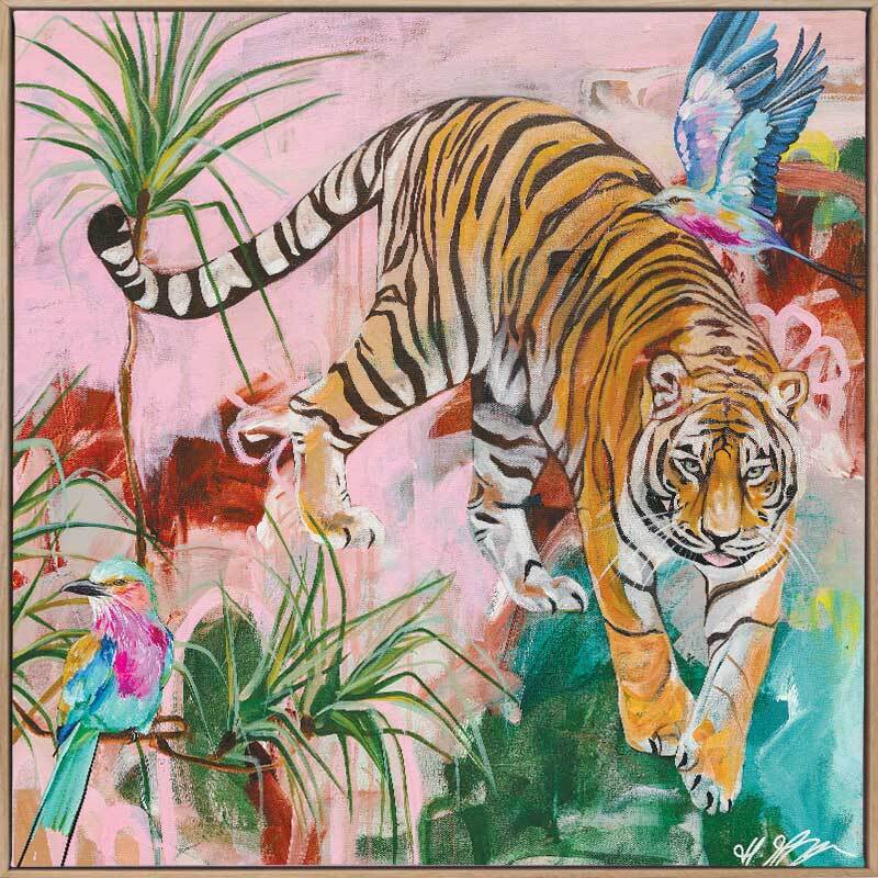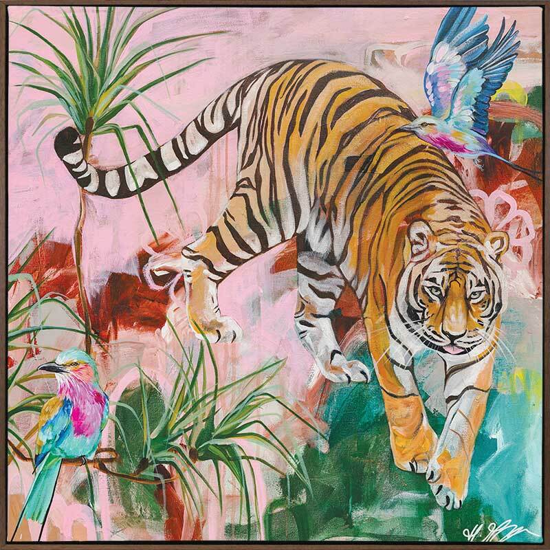 Self-taught artist Heylie Morris brings her dynamic collection of animals and female figures to Urban Road, focusing on the playfulness of Australian cockatoos and other native birds, as well as the majestic, powerful beauty of tigers, leopards and jaguars. This collection uses unique blends of colours and shapes, focusing on graphic brush strokes, detailed designs, and impactful colour palettes. Her rendition of the Australian Black Cockatoo is a particular standout, with beautifully detailed imagery and rich, vibrant colours.