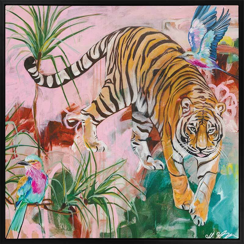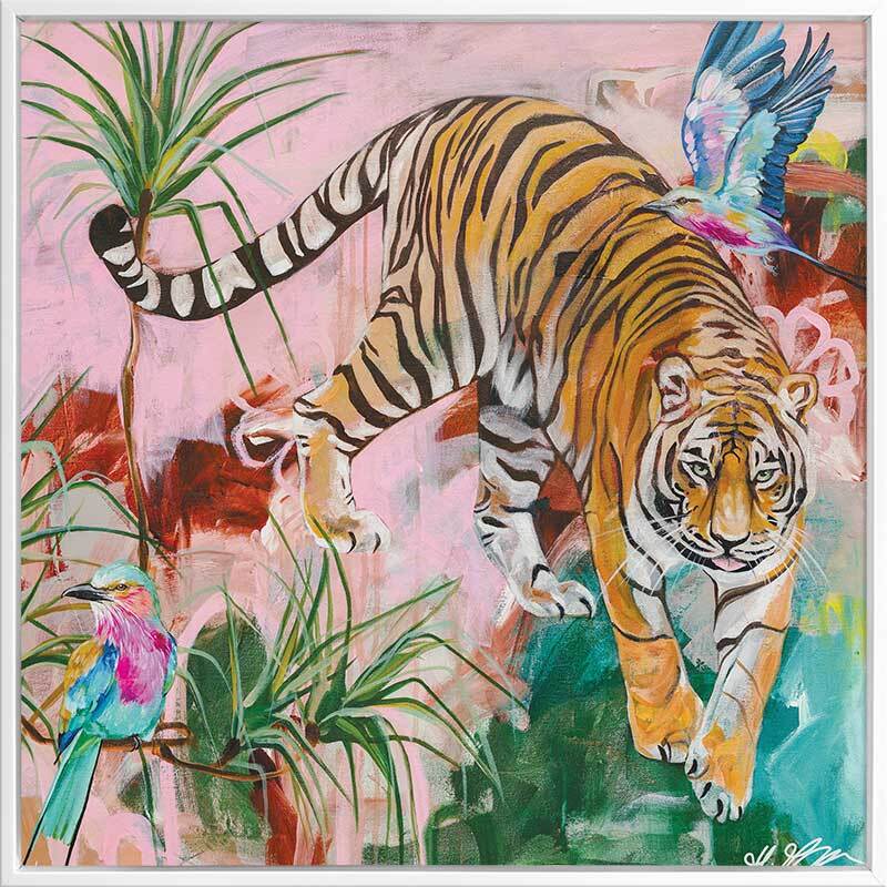Jungle Boogie Canvas Art Print - A stunning rendition of the king of the jungle, this piece uses a blend of abstract and realism with sprouting plants, detailed birds, and a majestic tiger on the hunt, all against a graphic backdrop with visible brush strokes. A fresh colour palette brings the scene to life, with bright pinks, reds, blues, and oranges.