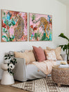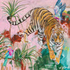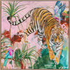 Jungle Boogie Canvas Art Print - A stunning rendition of the king of the jungle, this piece uses a blend of abstract and realism with sprouting plants, detailed birds, and a majestic tiger on the hunt, all against a graphic backdrop with visible brush strokes. A fresh colour palette brings the scene to life, with bright pinks, reds, blues, and oranges.