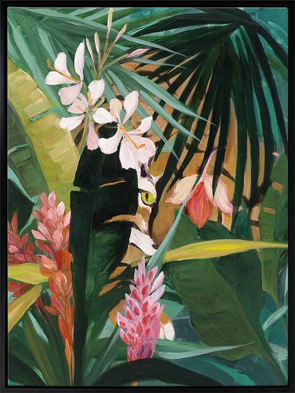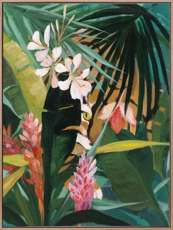 Jungle Peekaboo Tiger Canvas Art Print - Playful and rich in colour, this tropical inspired artwork features layers of leafy green palm fronds and soft pink florals hiding the peeking eye of a creeping jungle tiger. Pairs with Jungle Peekaboo Leopard.