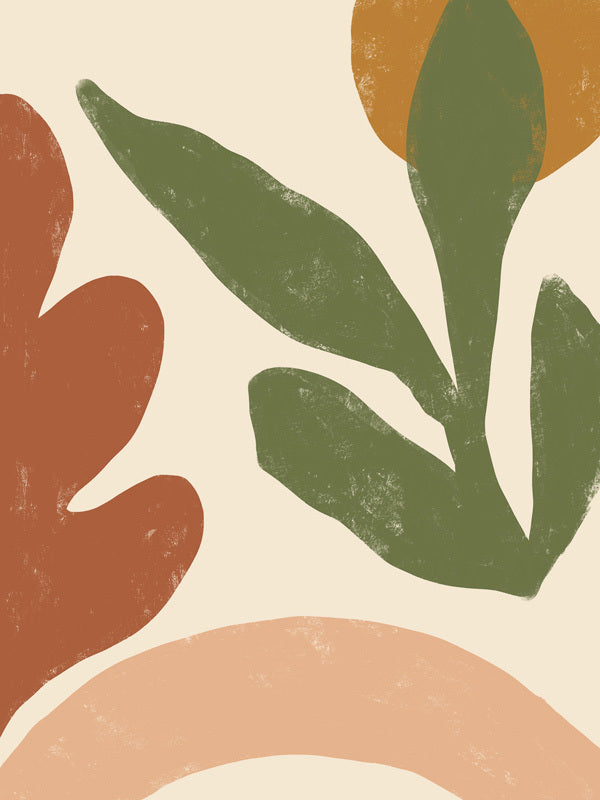 Juniper - An abstract artwork featuring organic leaf shapes in a warm, muted colour palette with brown and green elements.