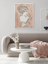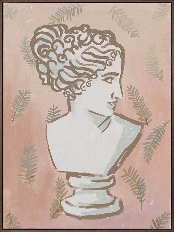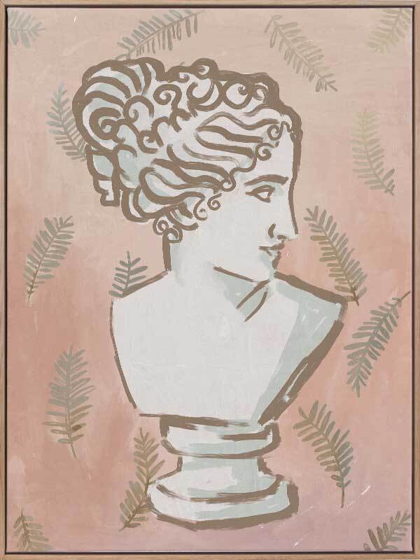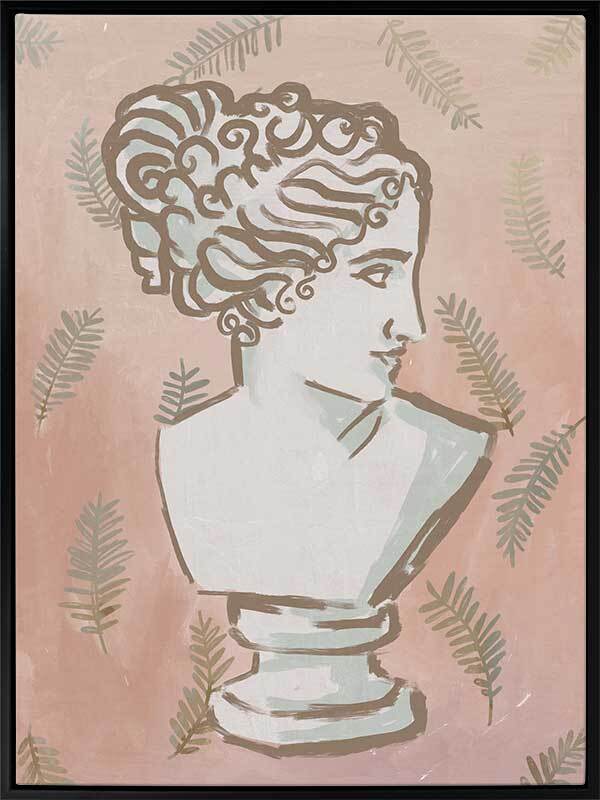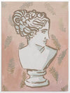 Juno Canvas Art Print - History lovers will be drawn to this soft, delicate depiction of ancient feminine beauty. This neutral illustrative artwork features a painting of a greek-style bust, against a gentle pink gradient overlaid with leaves.