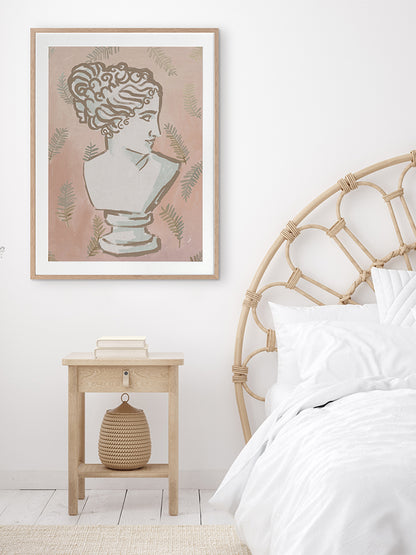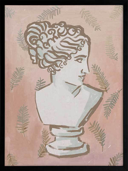Juno Framed Art Print - History lovers will be drawn to this soft, delicate depiction of ancient feminine beauty. This neutral illustrative artwork features a painting of a greek-style bust, against a gentle pink gradient overlaid with leaves.