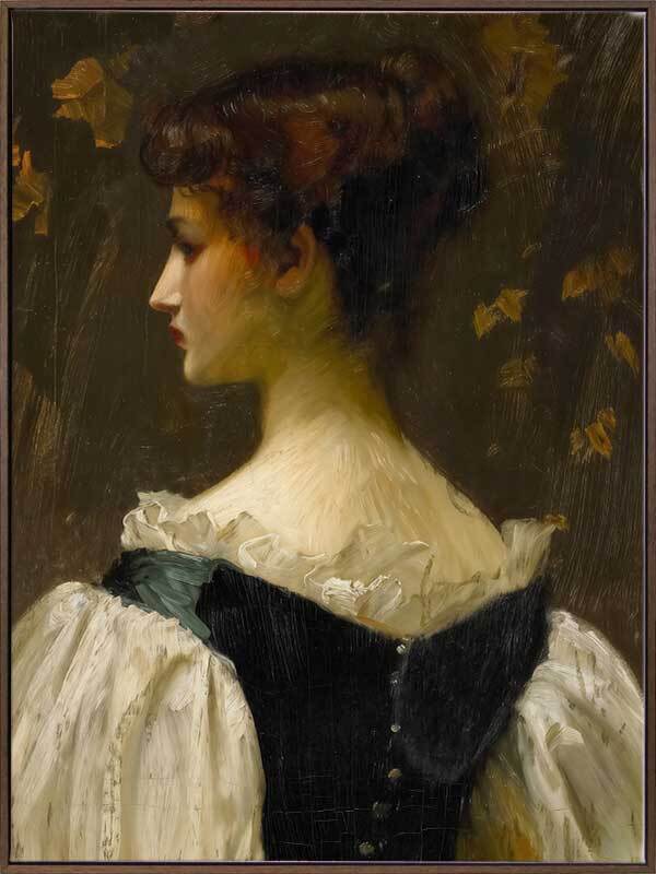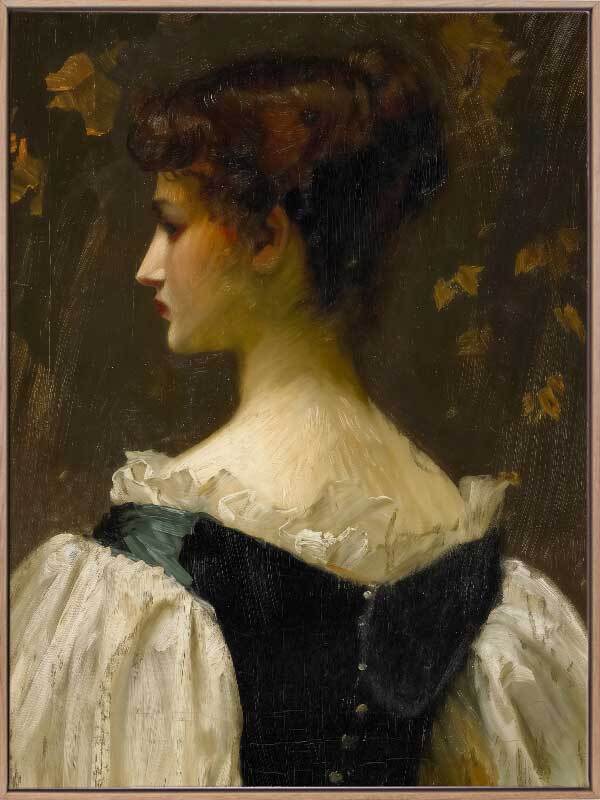 Katherine Canvas Art Print - This captivating artwork by Darren Palmer captures the quiet elegance of a young woman of a bygone era and her contemplative gaze. Pale whites contrast beautifully with the soft, autumnal background, the perfect cameo for a heritage style. Perfect for enhancing your bedsides, consoles, gallery hangs or mantles, this art print adds a touch of historical, vintage charm to a bedroom or living room.