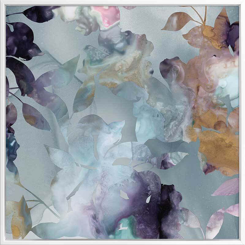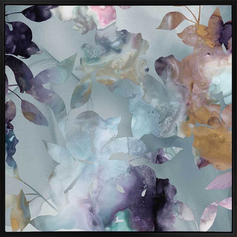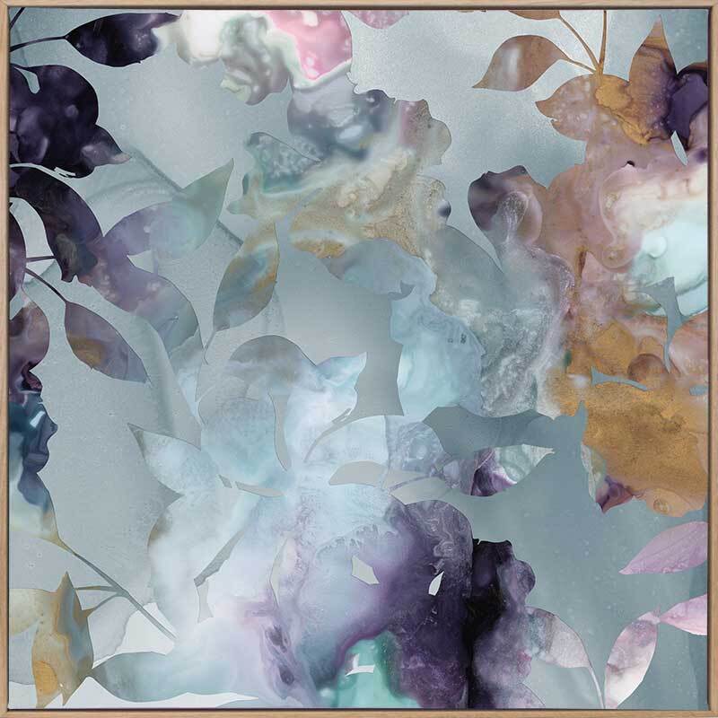Khloris Canvas Art Print: A soft, dreamy abstract artwork featuring floral cutouts and purple, blue and gold colour palette. 2020 AUTUMN/WINTER COLLECTION: REVERIE