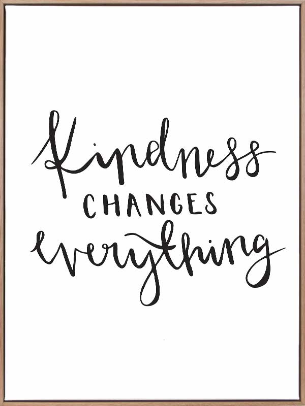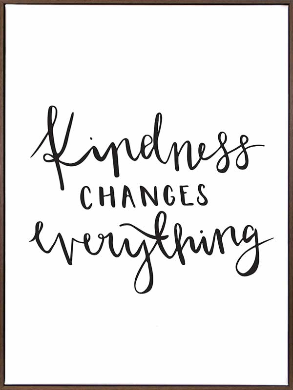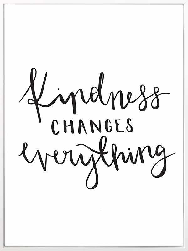 Kindness - A monochromatic typographic artwork featuring the words 'kindness changes everything', in cursive black font on a white background.