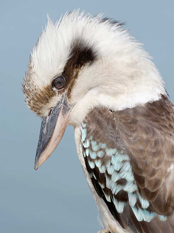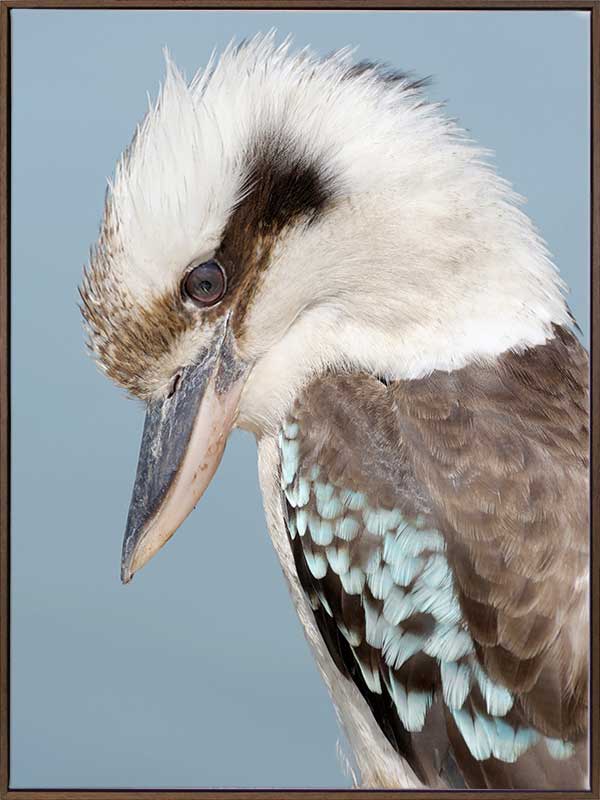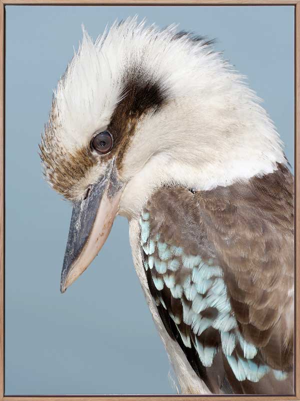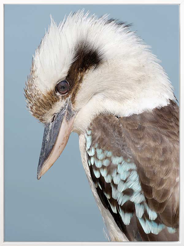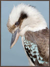 Kookaburra Poster Print. You can almost hear the laughing Kookaburra finding its territory in your space, sharing it's energy with you. The blue-grey background of this photographic print of the Kookaburra brings out the light green feathers of it's wing.