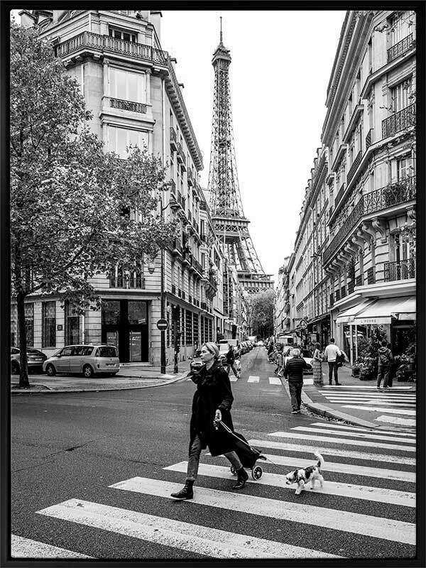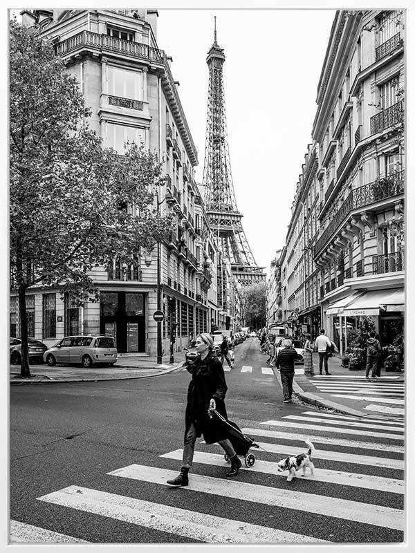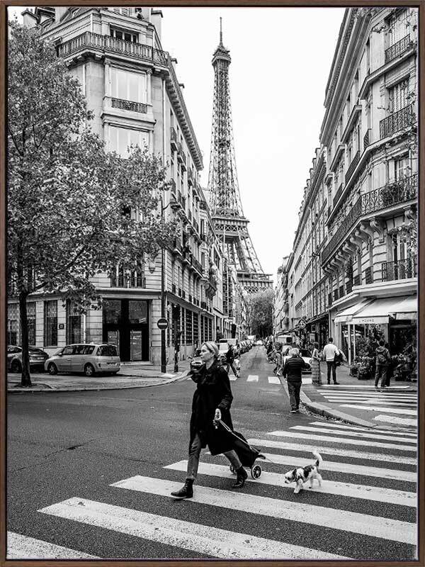 La Tour Eiffel Canvas Art Print - Ahh, c'est ça la vie. Transport any space into the city of love with this gorgeous photographic wall print featuring the Eiffel Tower in Paris, a woman walking her dog, and streets lined with cafés brimming with Parisians and the scent of coffee and croissants. With a black-and-white palette, this cityscape travel photography brings an elegant touch to any room.