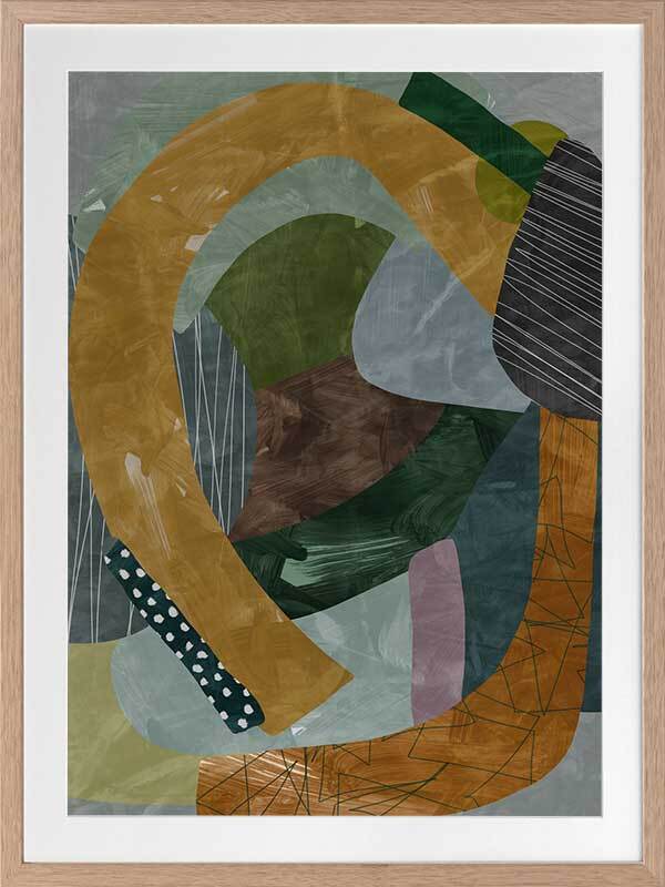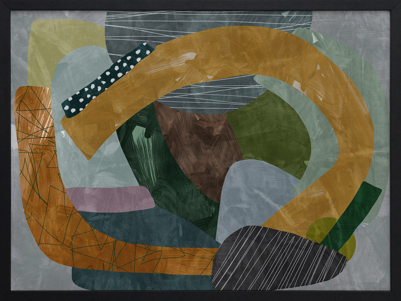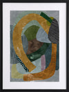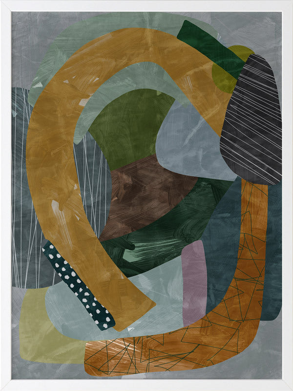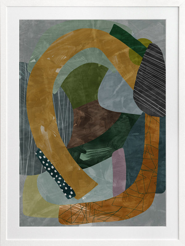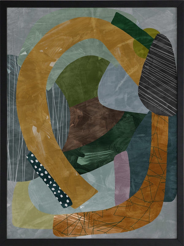 Labyrinth II Framed Print: An abstract artwork featuring overlapping curves, shapes and patterns. Featuring a muted green, mustard and grey colour palette, with elements of smoky blue and purple, over a grungy textured background. Pairs with Labyrinth I. 2019 AUTUMN/WINTER COLLECTION: ODYSSEY