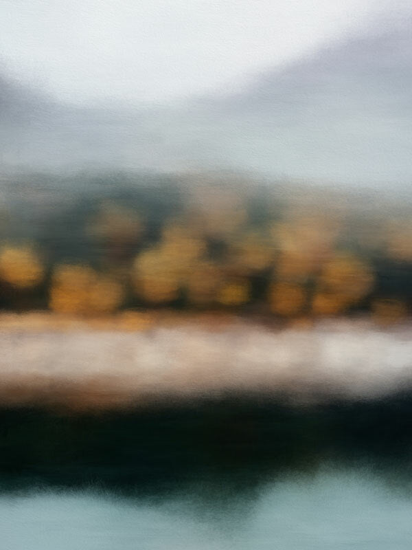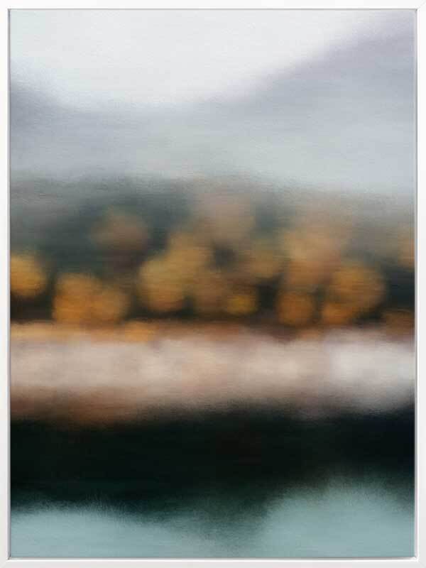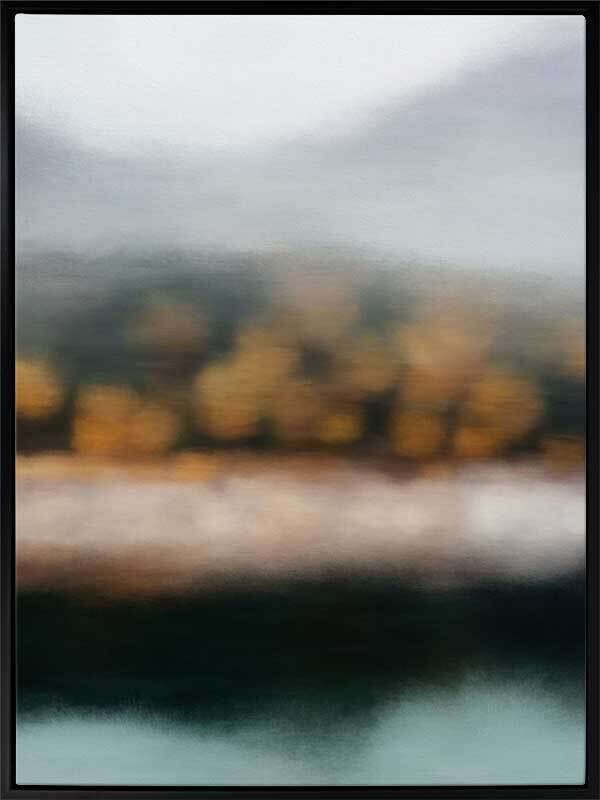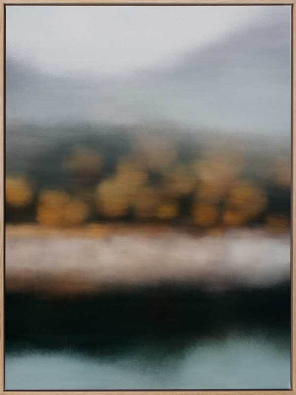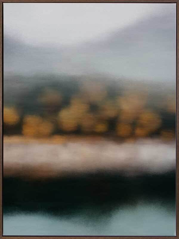 Lake Alta Canvas Art Print: A blurred landscape artwork featuring orange-brown trees along a muted lakeside shoreline. 2019 AUTUMN/WINTER COLLECTION: ODYSSEY