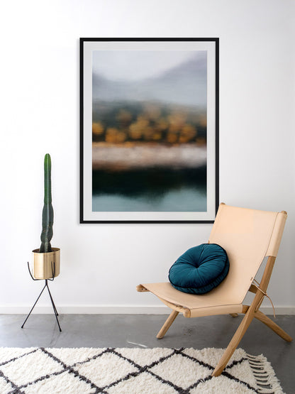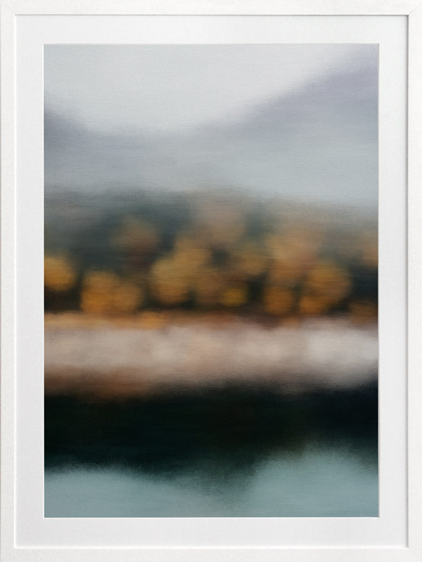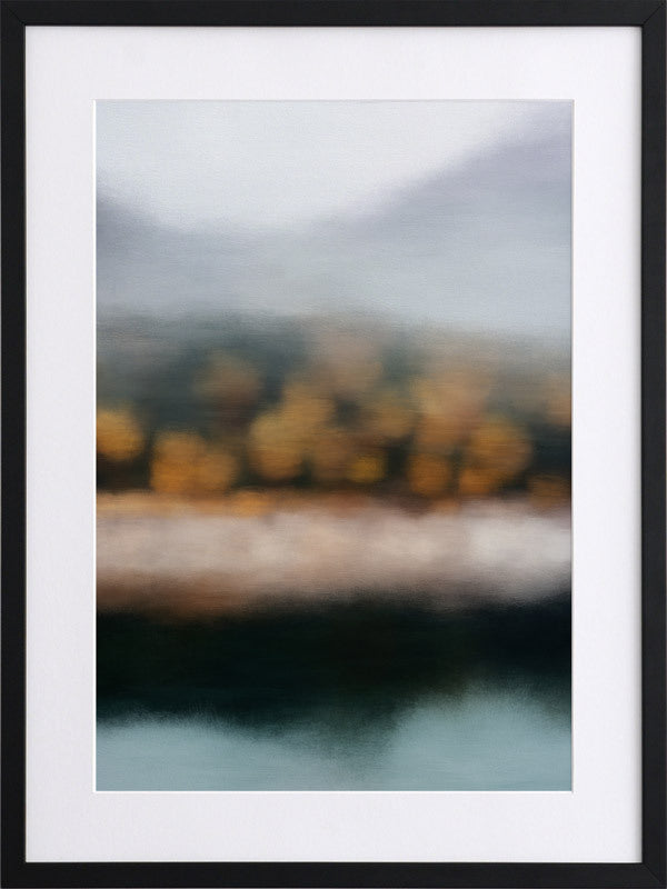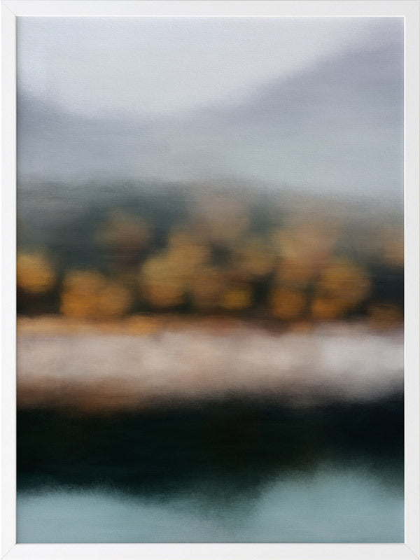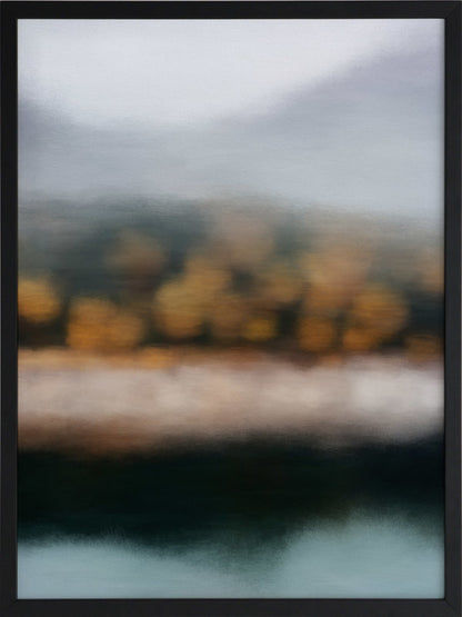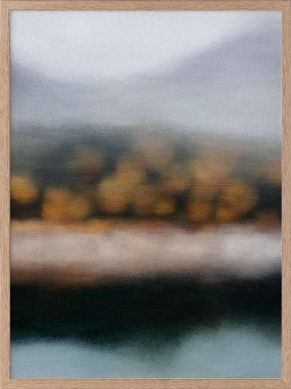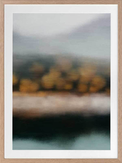 Lake Alta Framed Print: A blurred landscape artwork featuring orange-brown trees along a muted lakeside shoreline. 2019 AUTUMN/WINTER COLLECTION: ODYSSEY