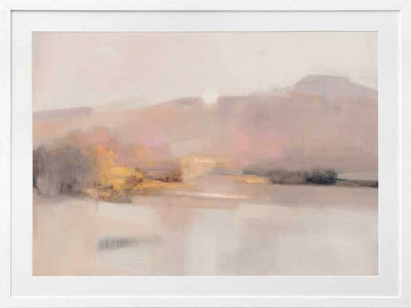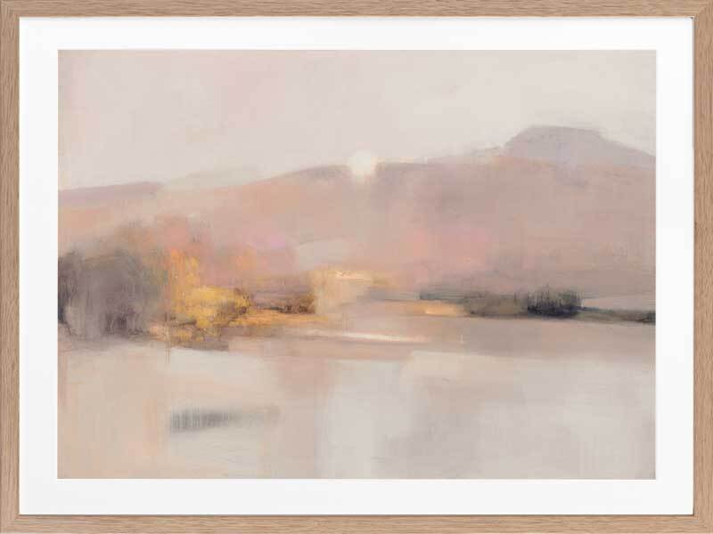 Lake Lights Framed Art Print - Sunrise, or sunset? Upon a background of mountainous terrain, take in a vibrant shoreline in tones of charcoal, marigold and pastel pink overlooking a glassy seascape. This beautiful landscape delivers a welcome soothing effect well suited to a variety of interior styles. This contemporary landscape artwork will bring love and warmth to your space.