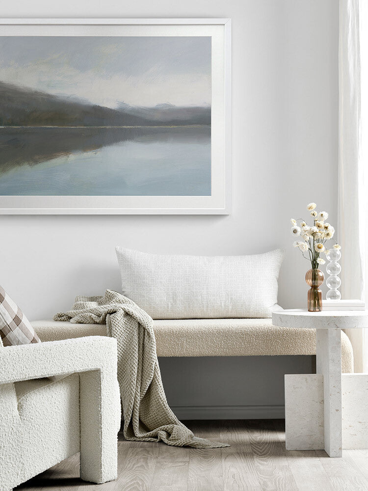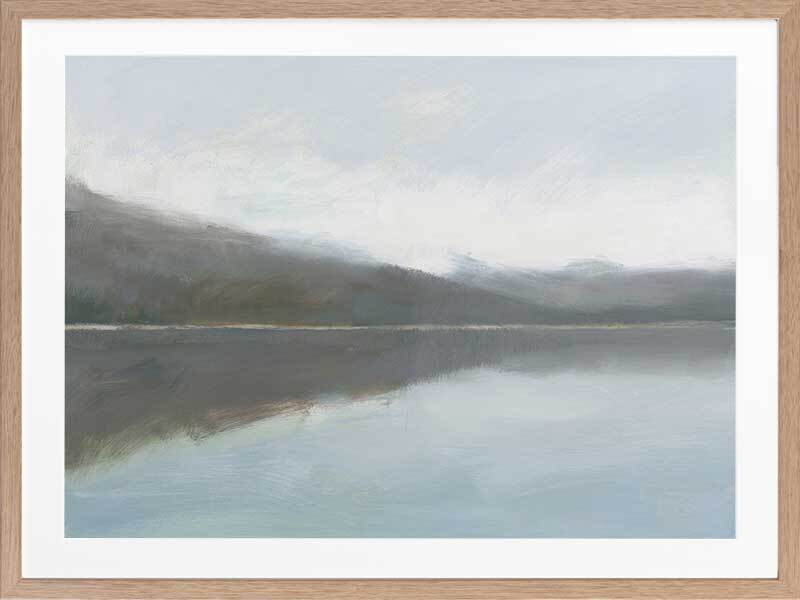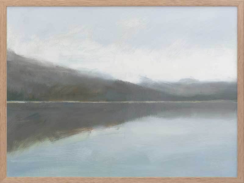 Lake Mode Framed Art Print - Serene and surreal, this shining landscape is a dramatic depiction of a sweeping ocean and rustic brown and grey hilly shore. The sea reflects the land, clouds and sky in shades of smoke and pale blue, creating a striking duality that draws you right onto the glassy surface of the water. The pure serenity of a still lake reflecting a perfect mirror image draws you in to a place of tranquillity. The muted tones of nature in the wild are captured so poignantly here, bringing peace and calm to your interior space.