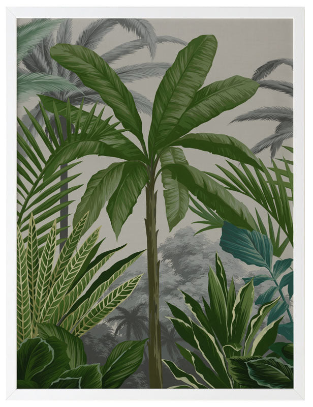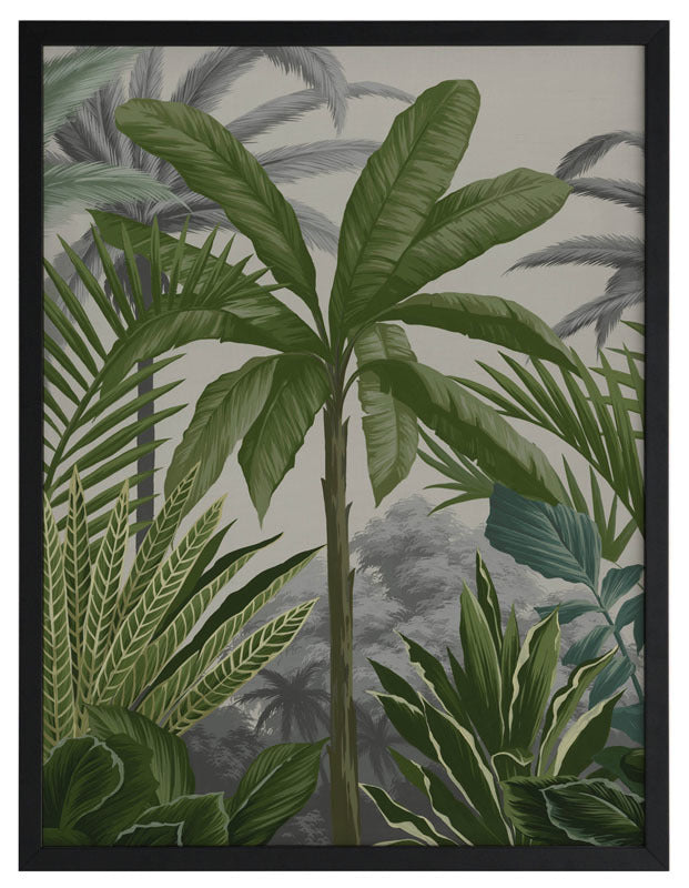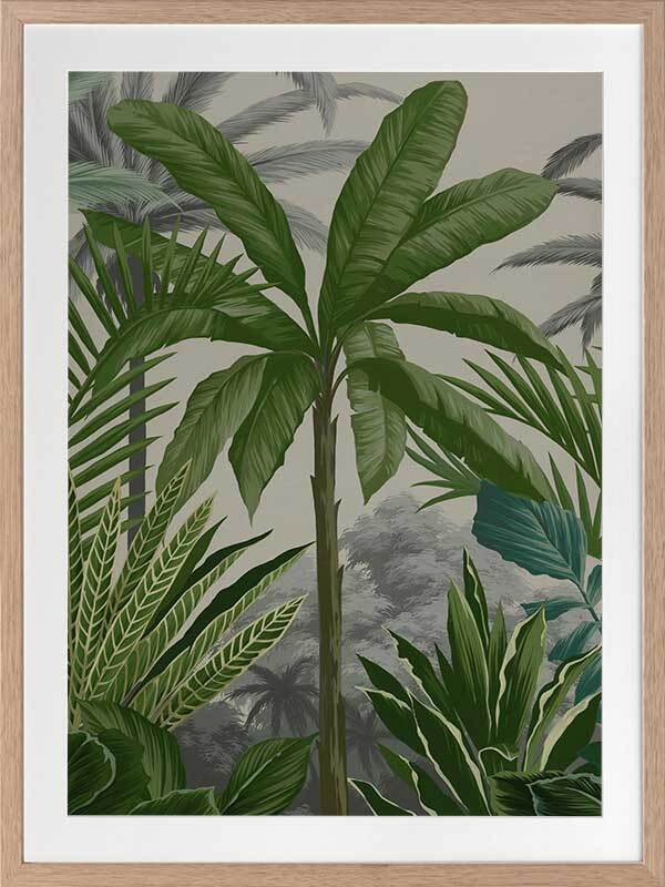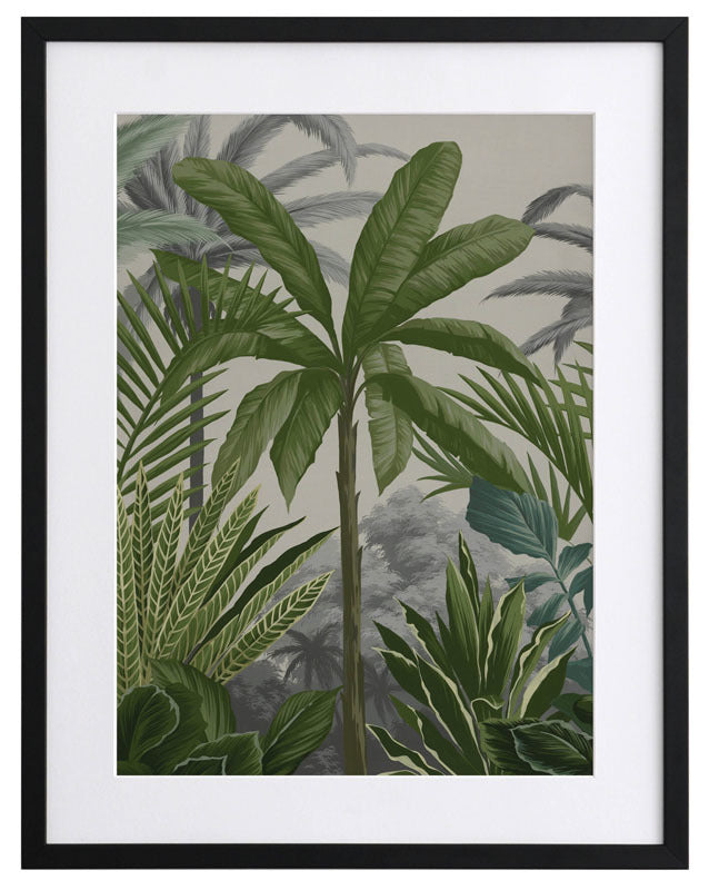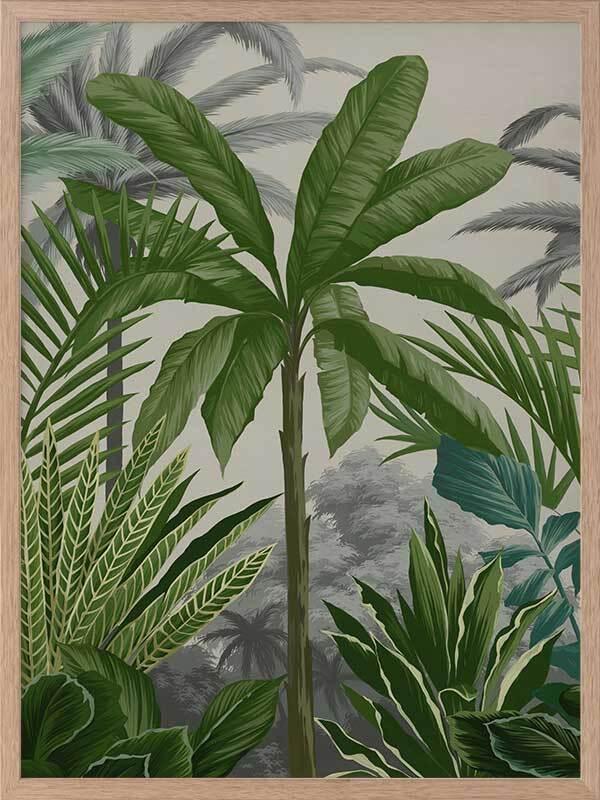Las Palmas II Framed Print: Part two of a jungle inspired mural piece featuring layered tropical foliage on a beige background. Designed to be displayed as a triptych with Las Palmas I & III. 2018 AUTUMN/WINTER COLLECTION: CONTINUUM