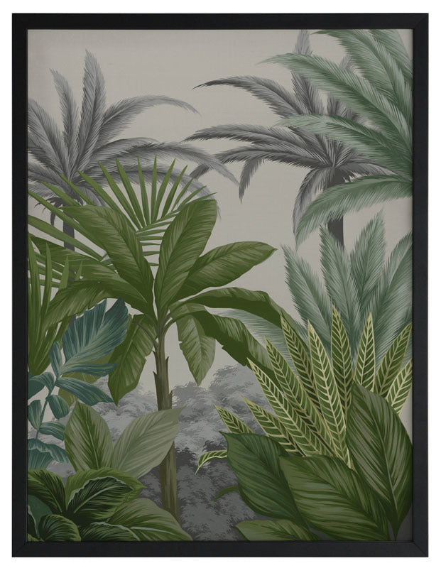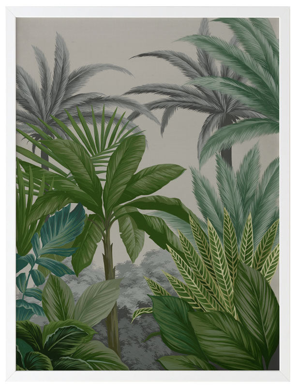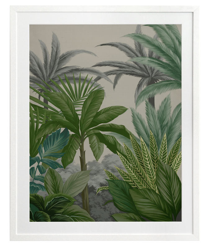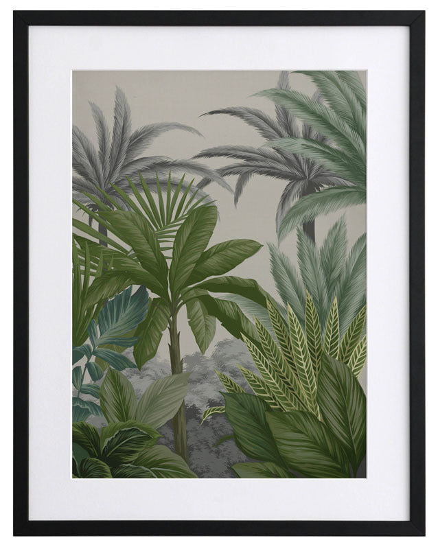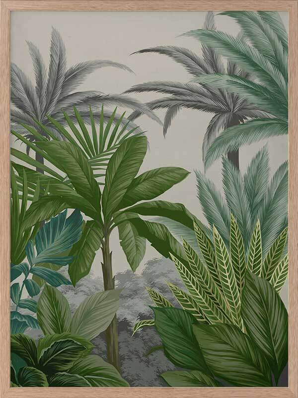 Las Palmas III Framed Print: Part three of a jungle inspired mural piece featuring layered tropical foliage on a beige background. Designed to be displayed as a triptych with Las Palmas I & II. 2018 AUTUMN/WINTER COLLECTION: CONTINUUM