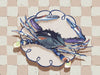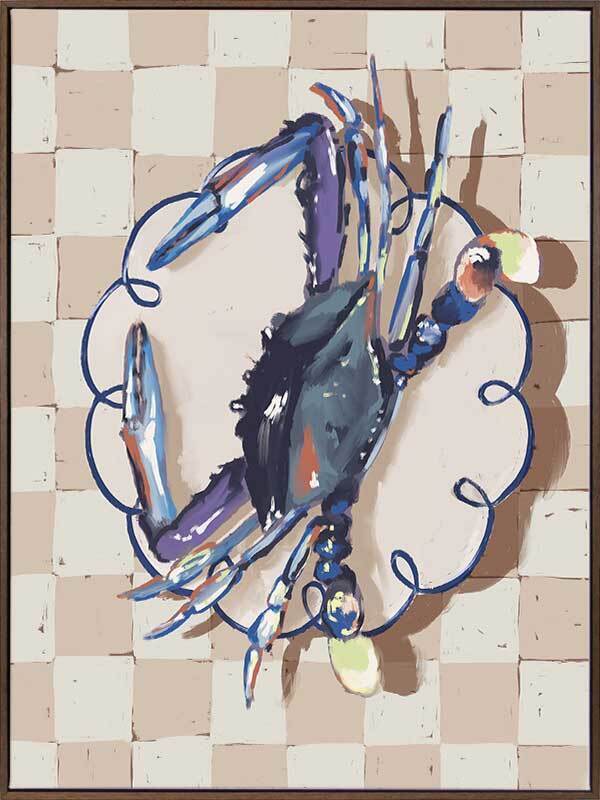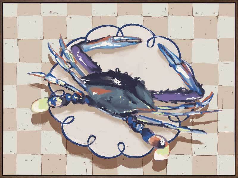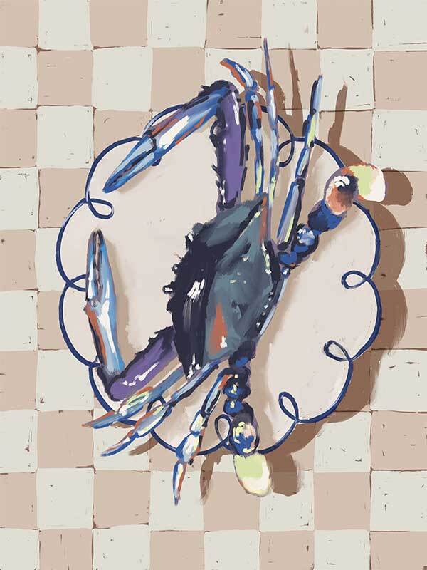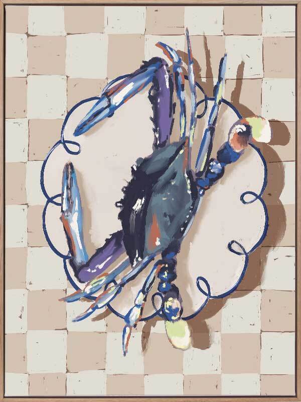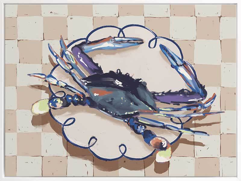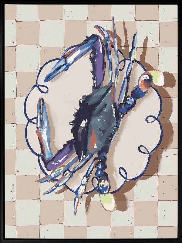 Late Lunch Blue Canvas Art Print - Up for a late lunch? This still life piece takes an abstract look at a freshly caught crab, placed delicately atop a porcelain plate, ready to eat. A checkerboard pattern in the background gives this piece a relaxed feel, with a simple palette featuring shades of blue, beige and white.