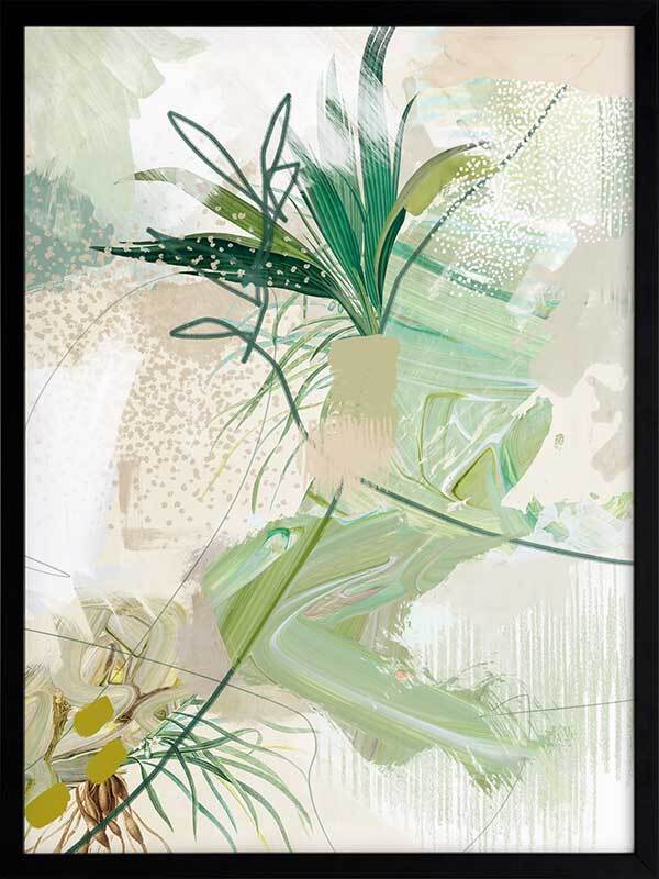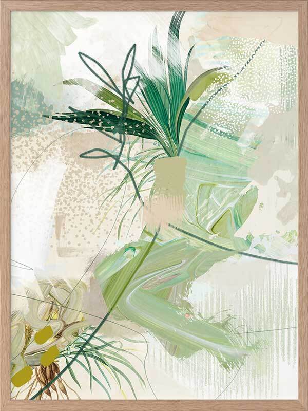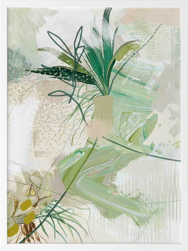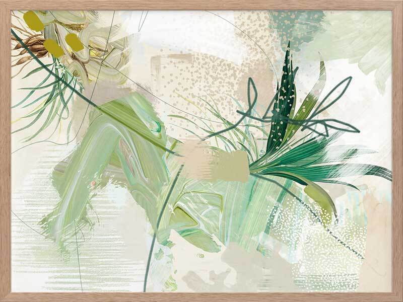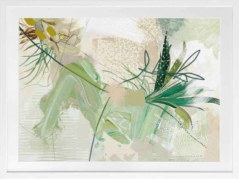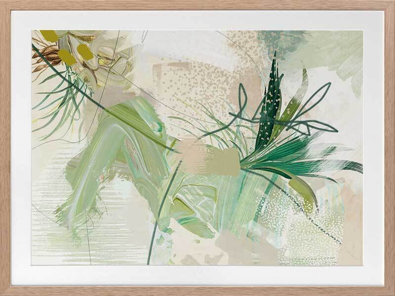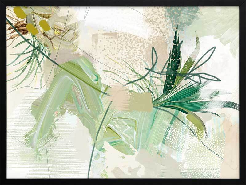 Leafy Greens Framed Print: A playful, botanical-inspired abstract that overlays strokes, textures and patterns in a fresh, green and neutral colour palette. 2020 AUTUMN/WINTER COLLECTION: REVERIE