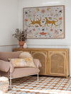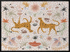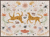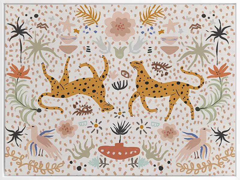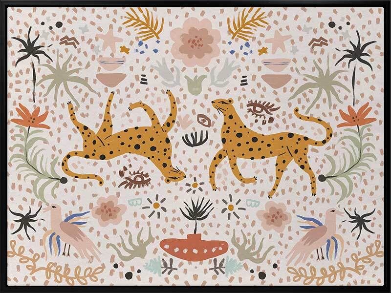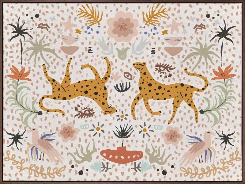 Leaping Leopards Canvas Art Print - Bold and eccentric, this fun and playful illustration features a motif of hand drawn elements, including leopards, birds and botanicals. The colour palette is soft and colourful, featuring blush, sage and mustard tones.