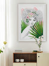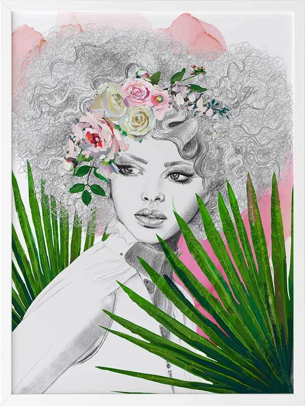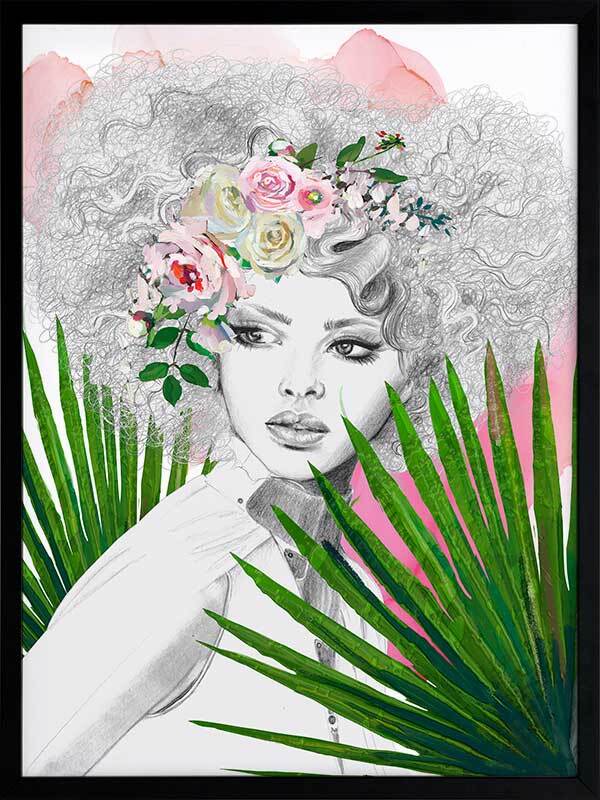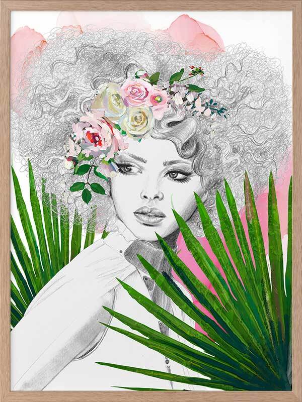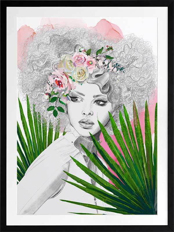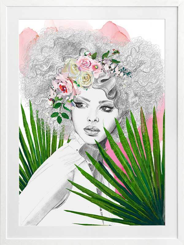 Leo Framed Art Print - A captivating portrait piece of sister Leo, as part of the Zodiac Sisters series. Using strong colours of vivid green, pink, and hints of yellow, along with solid linework and fine details, this piece emulates the fierce, bold energy of the Leo zodiac sign. Leaving the woman in the centre with a greyscale palette creates a beautiful contrast to the surrounding colours.