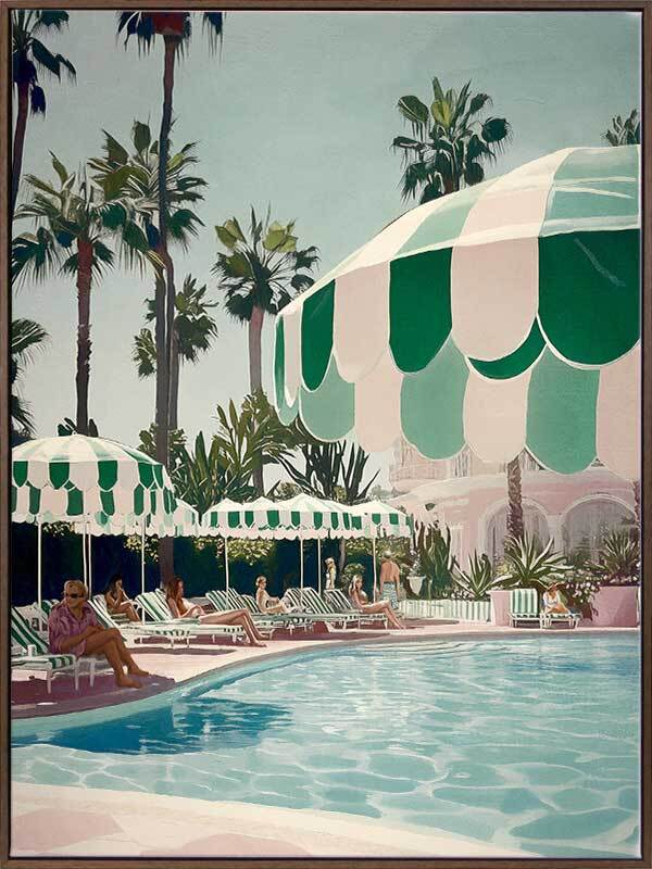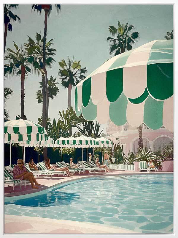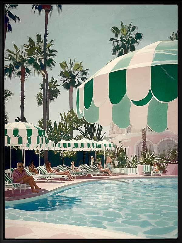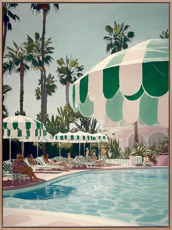 Life Choices Canvas Art Print - Sun-drenched luxury awaits in this vibrant poolside scene from Shaynna Blaze's exclusive designer collection. Evoking the glamour and effortless elegance of Palm Springs, this limited edition retro art print brings a sense of leisure and sophistication with a calming palette of greens, blues, and neutrals. With a rich architectural art deco influence, the towering palm trees, striped umbrellas, and chic figures lounging by the water infuse a laid-back yet stylish atmosphere. Perfect for any interior design, this piece is ideal for elevating your living room or bedroom with a touch of timeless vacation bliss.
