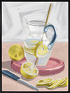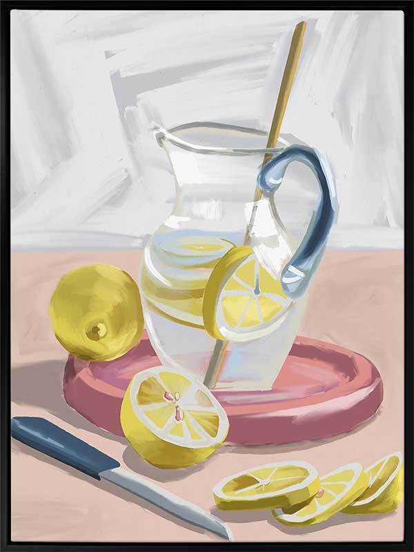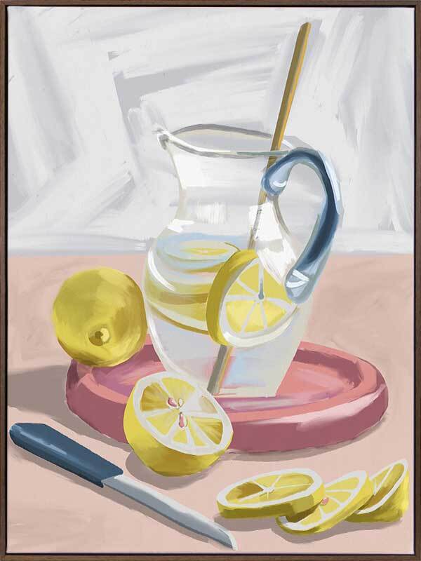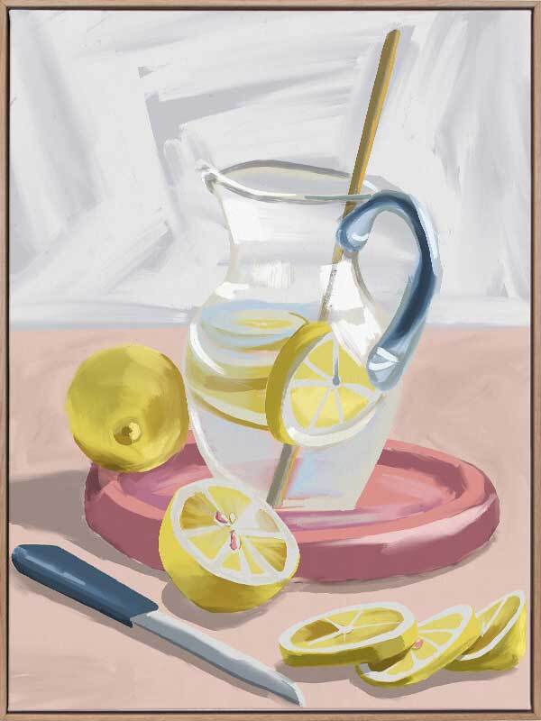 Life & Lemonade Canvas Art Print - This handpainted art print depicts a pitcher filled with lemonade. Lemon slices, a dark pink plate supporting the pitcher sits on top of a peach table and contrast against a dirty white background.