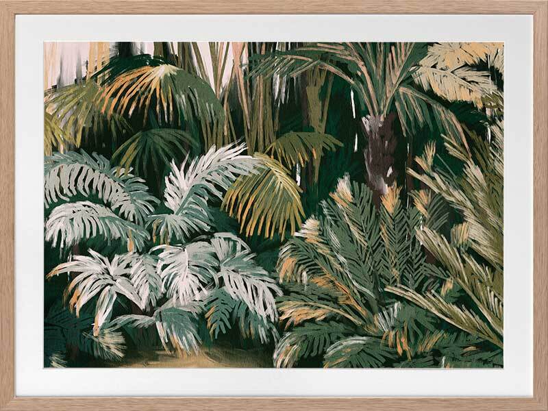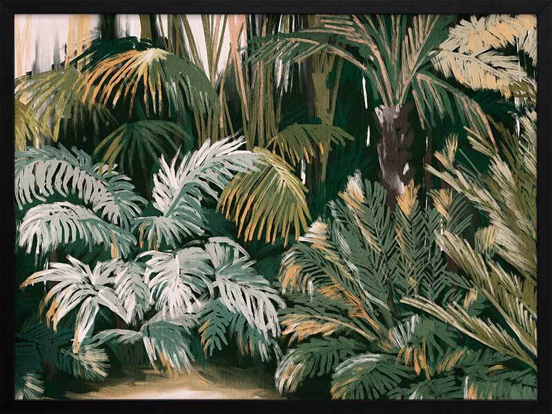 Life's a Jungle Framed Art Print - Moody and mysterious, this lush tropical artwork features layers of palms, ferns and foliage in an earthy green colour palette. The perfect addition to any home in need of some peace and calm.