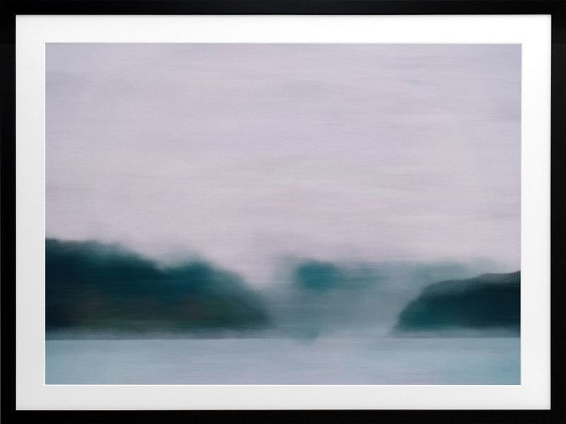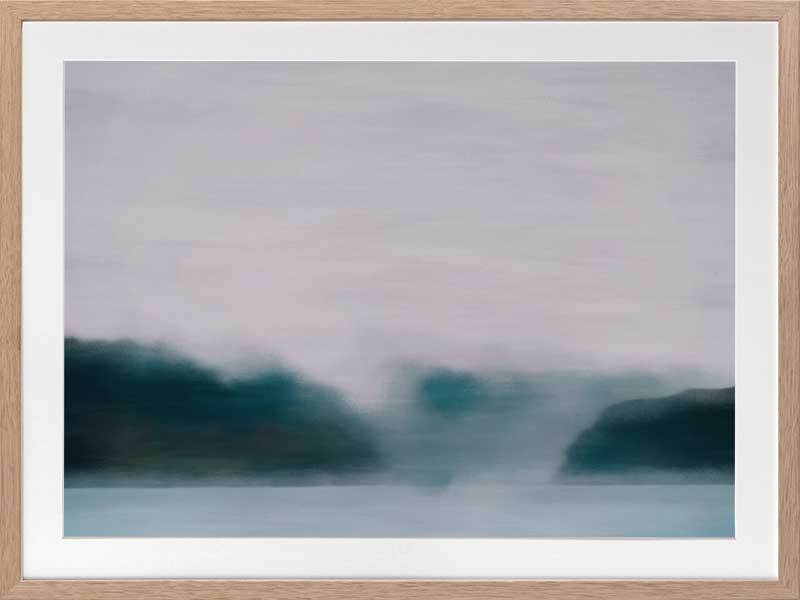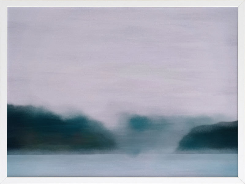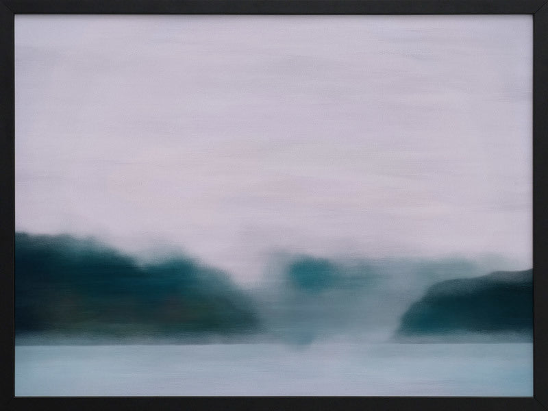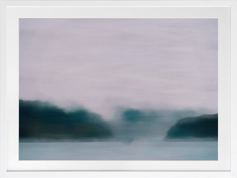 Lilac Sky Framed Print: A blurred landscape artwork featuring a deep, emerald treeline, a smoky blue lake, and a soft lilac sky. 2019 AUTUMN/WINTER COLLECTION: ODYSSEY