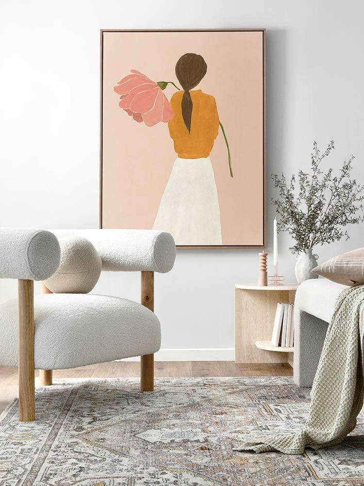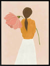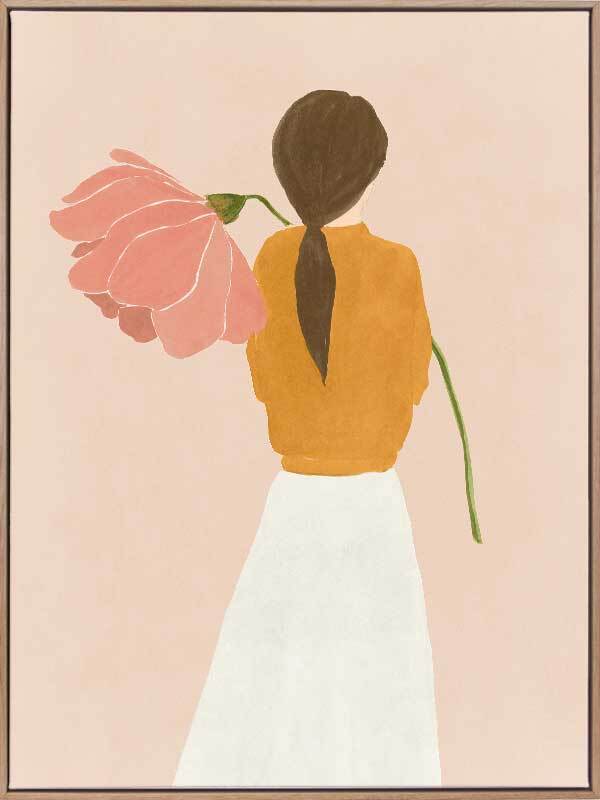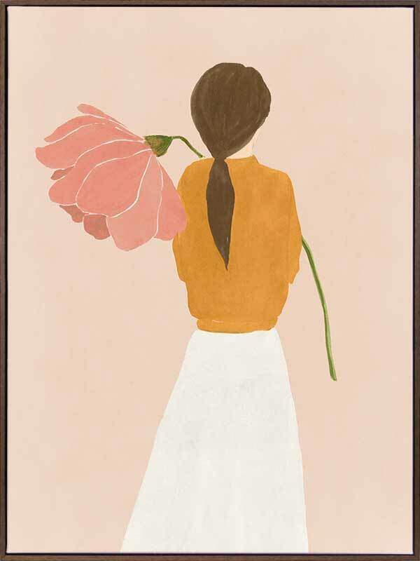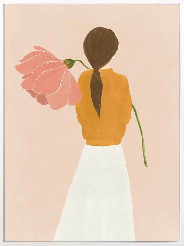 Lilian in September Canvas Art Print - Capturing spring energy, this simple yet spirited back portrait shows the back of a woman in a long white skirt and mustard blouse carrying a singular pink bloom of proportions we could only dream of. Set on a background of palest pink, this positive piece will bring joy to any room.