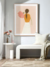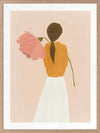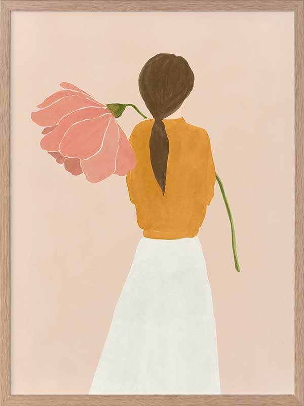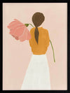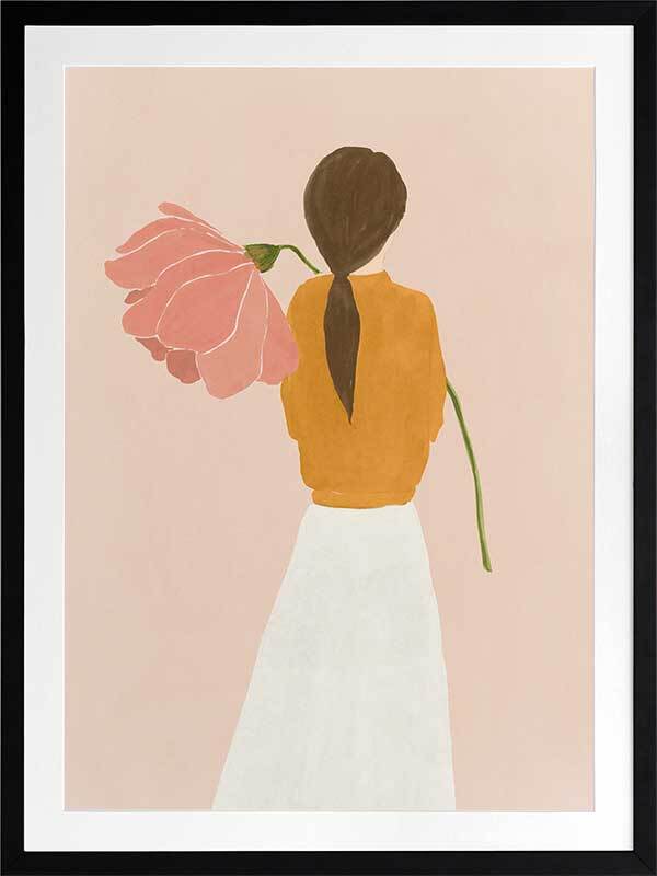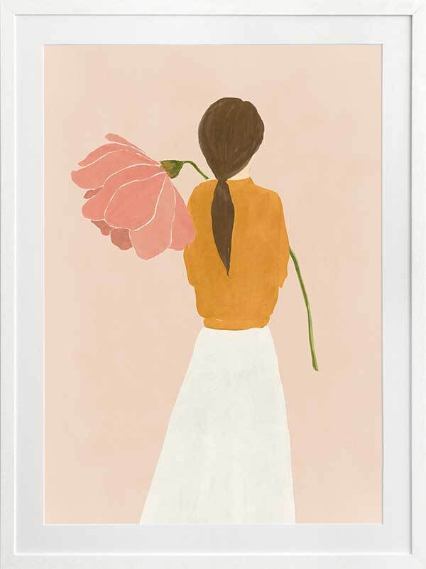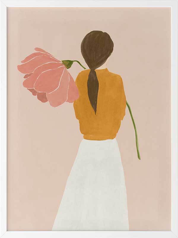 Lilian in September Framed Art Print - Capturing spring energy, this simple yet spirited back portrait shows the back of a woman in a long white skirt and mustard blouse carrying a singular pink bloom of proportions we could only dream of. Set on a background of palest pink, this positive piece will bring joy to any room.