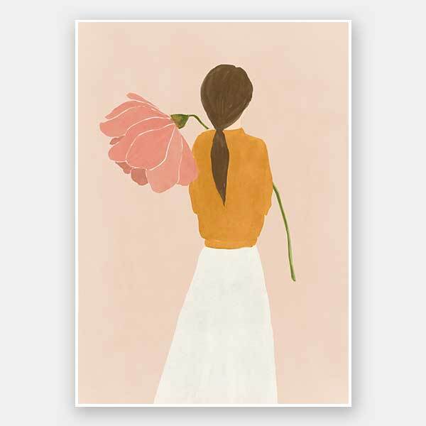 Lilian in September Unframed Art Print - Capturing spring energy, this simple yet spirited back portrait shows the back of a woman in a long white skirt and mustard blouse carrying a singular pink bloom of proportions we could only dream of. Set on a background of palest pink, this positive piece will bring joy to any room.