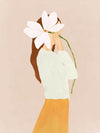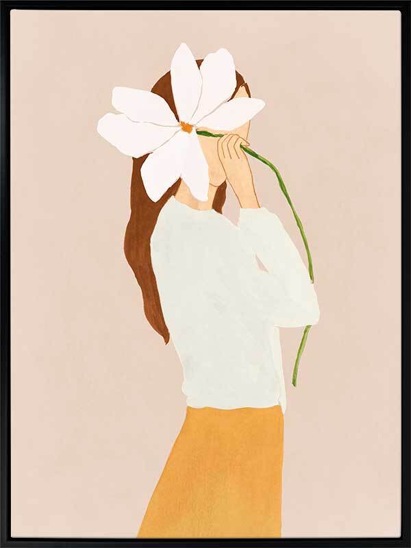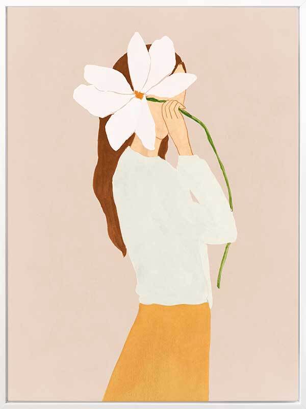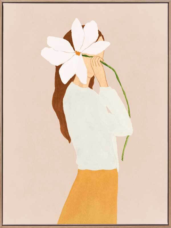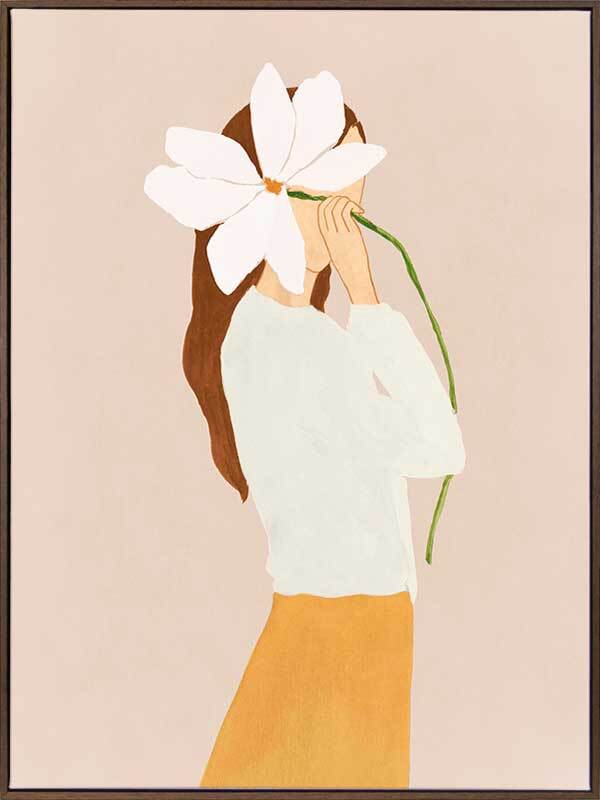 Lilian Peeps Canvas Art Print - Cheeky yet demure, a faint pink background shows off a woman in ivory and mustard, playing shy (or playing us all) as she peeps out from behind an oversized white flower. Playful and fun, its clean cut lines deliver a modern classic.